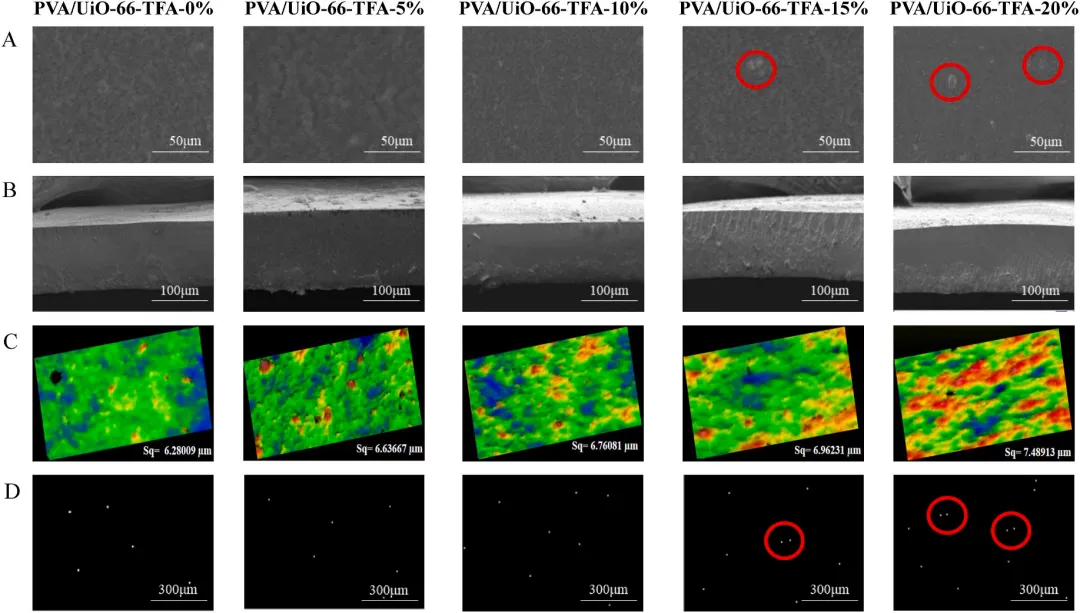 在薄膜层面,均匀分散的 UiO-66-TFA 与 PVA 之间形成氢键与化学键双重作用,有效限制 PVA 链段运动,提升拉伸强度与热稳定性,同时延长水蒸气扩散路径,降低 WVP。