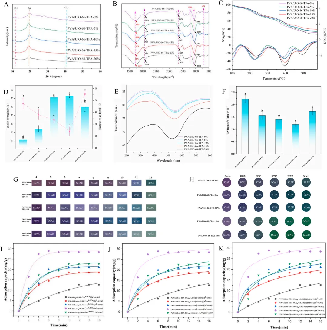 因此,15% 并非一个经验性的"最优点",而是材料分散状态与功能发挥之间精确平衡的结果:分散均匀时,UiO-66-TFA 既提供最多的吸附位点,又不破坏 PVA 基体的结构完整性。