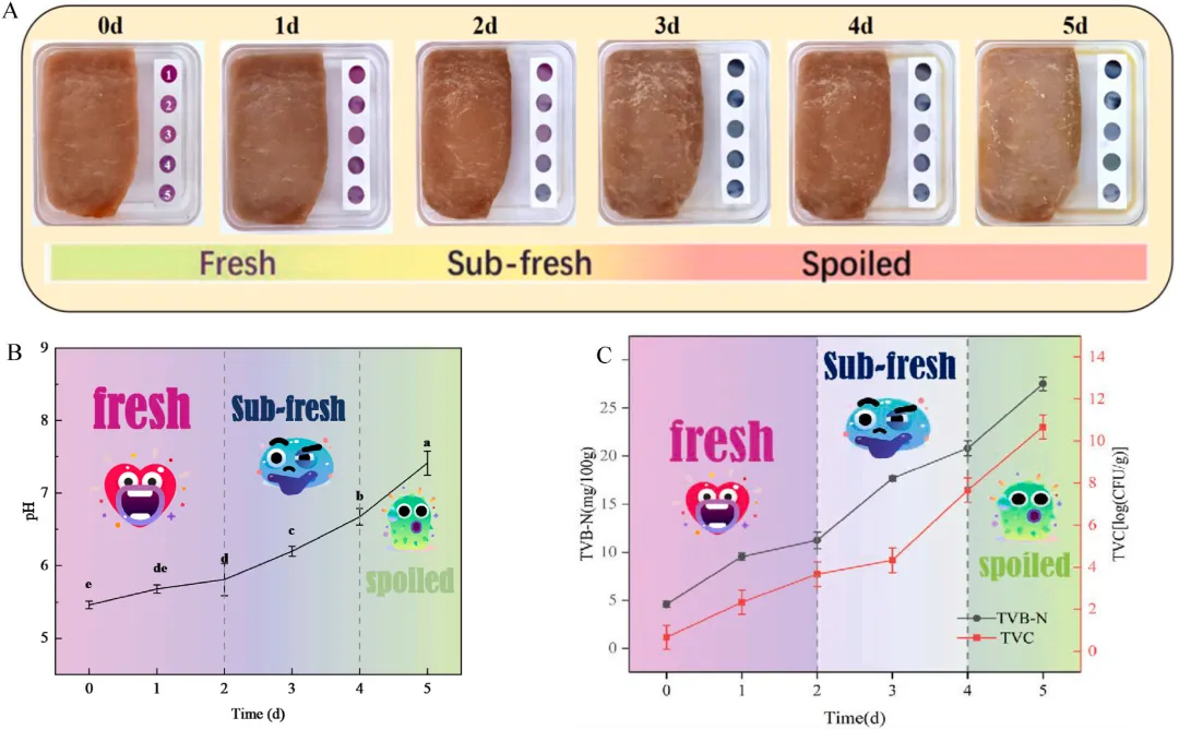 冷鲜猪肉(4 °C 储存 5 天)的实际监测实验中,同步测定 pH、TVB-N 与 TVC,并记录薄膜颜色变化(ΔE 值),以建立视觉信号与腐败指标之间的定量关联。