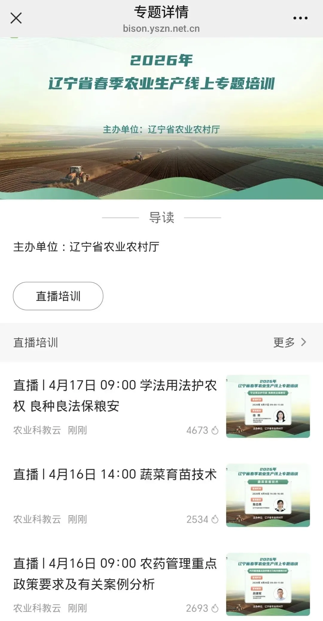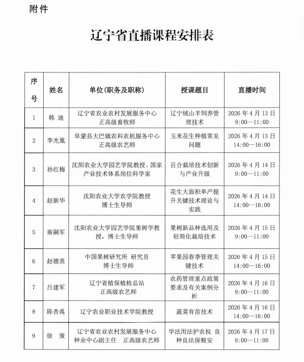 辽宁省农业农村厅将于2026年4月13-17日,上午9:00-11:00,下午14:00-16:00,开展全省春季农业生产线上专题培训活动。可通过“云上智农”APP或扫描观看。请大家积极观看。