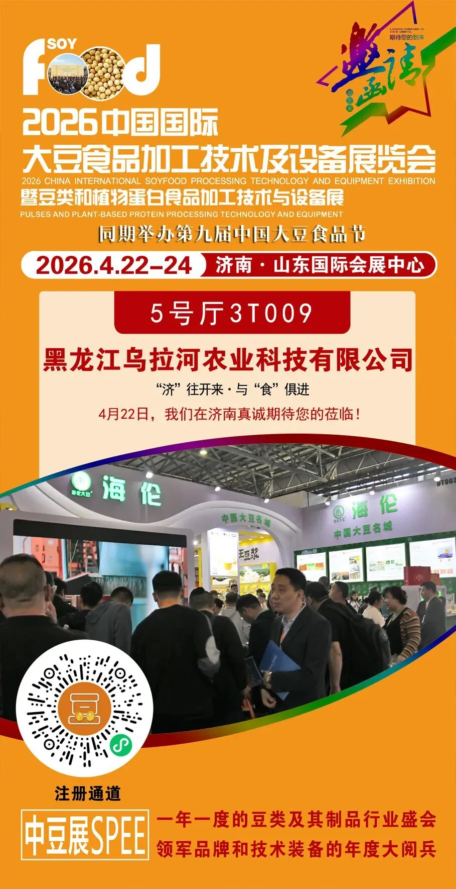 4月22日-24日,一年一度的豆制品全产业链盛会,2026中国国际大豆食品加工技术及设备展览会暨豆类和植物蛋白食品加工技术与设备展(中豆展SPEE2026)将在济南·山东国际会展中心隆重举行。黑龙江乌拉河农业科技有限公司(展位号:5号厅3T009)诚邀行业伙伴、新老朋友共赴盛会!