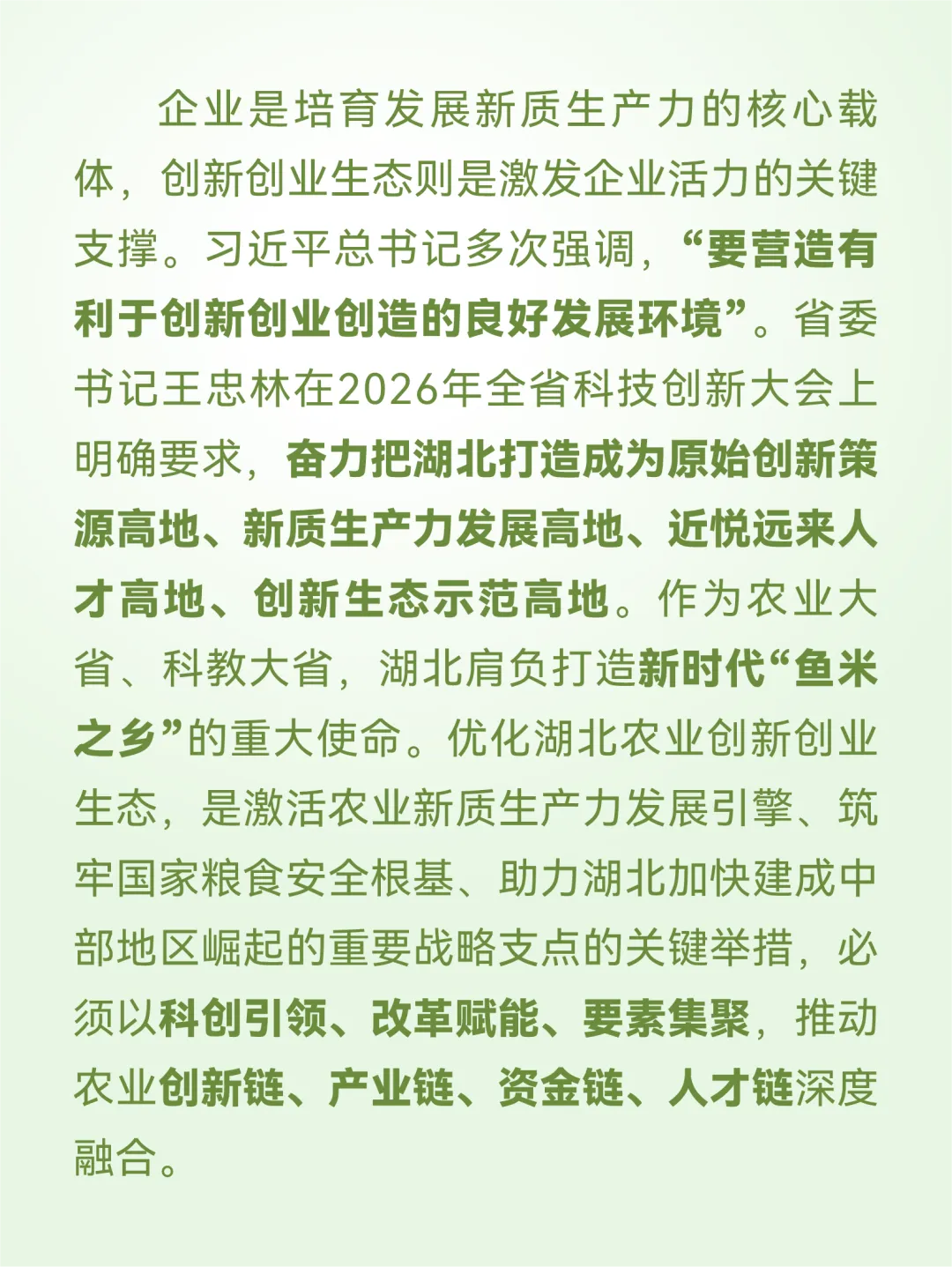 锚定“四区”建设目标,政策导向鲜明。2026年省委农村工作会议明确提出“十五五”湖北“三农”工作的战略目标,着力建设国家优质农产品生产区、农业产业化发展先导区、农业科技创新引领区、宜居宜业和美乡村样板区。其中,“农业科技创新引领区”的定位,为农业创新创业生态建设提供了战略指引,标志着湖北农业科技创新从跟跑向并跑、领跑转变,为农业新质生产力培育指明了方向。