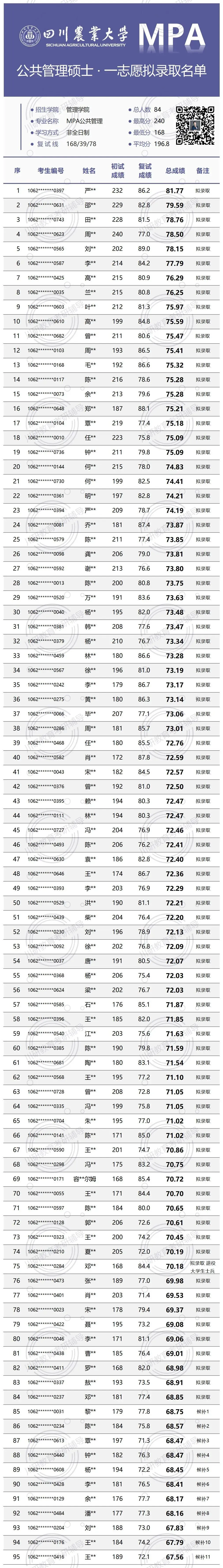 四川农业大学管理学院2026年MPA公共管理拟录取名单公布,名单显示,一志愿拟录取84人(含退役大学生士兵1人),候补11人。拟录考生初试成绩最高240分,最低168分,平均196.8分。