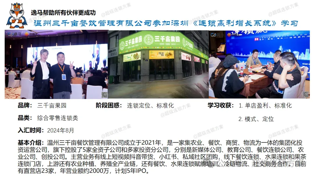 2024年,三千亩果园(以下简称“三千亩”)携手逸马,开启了在水果连锁领域战略陪跑,逸马团队与三千亩团队一起,持续改善门店经营,通过全面赋能手把手带教团队,并全面落地,助力增长。