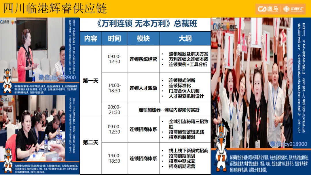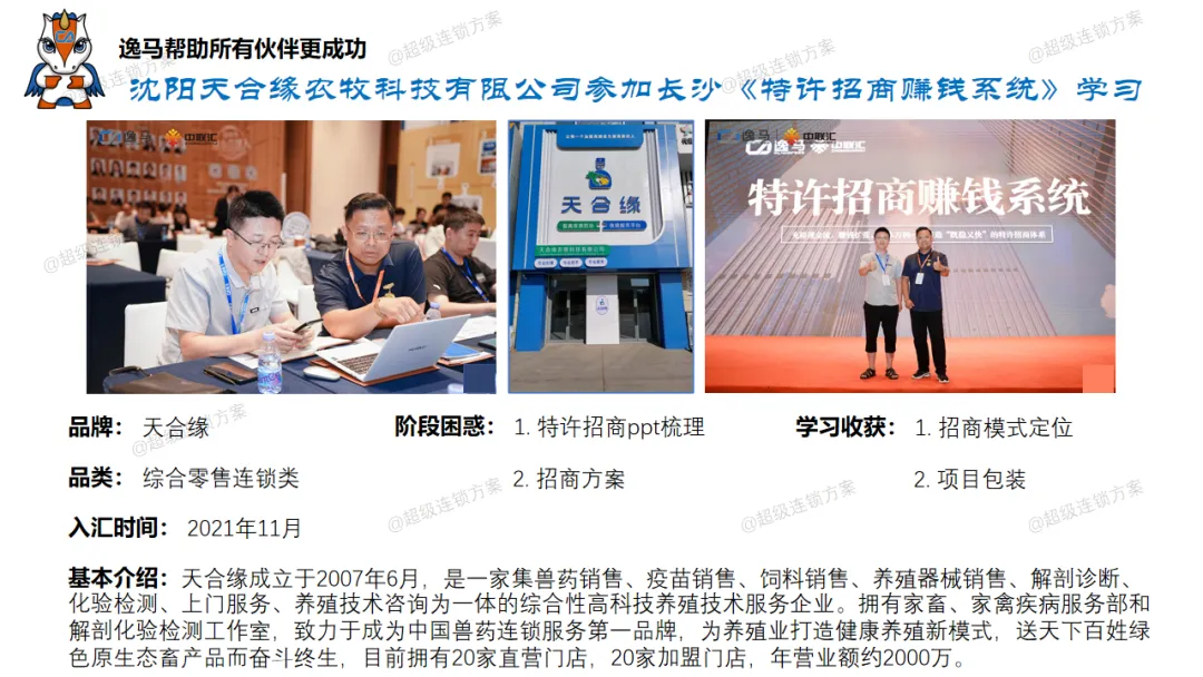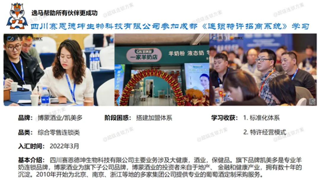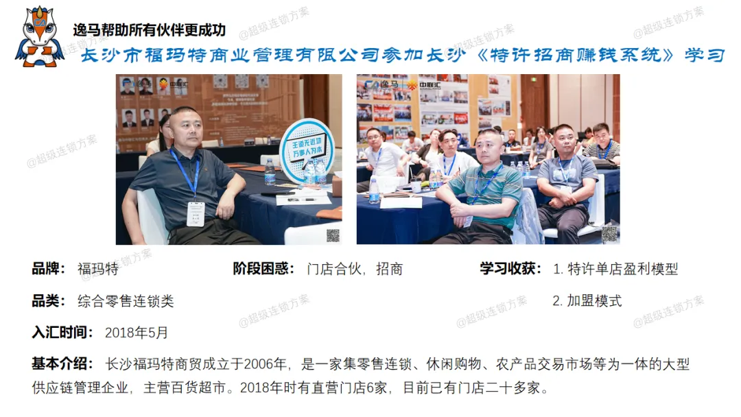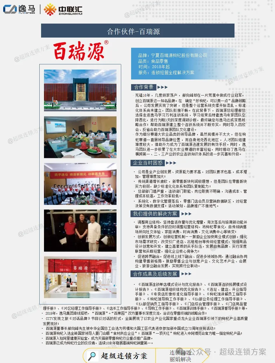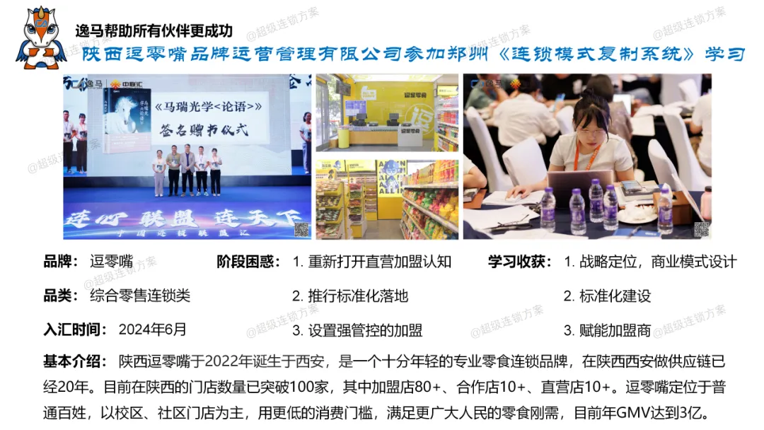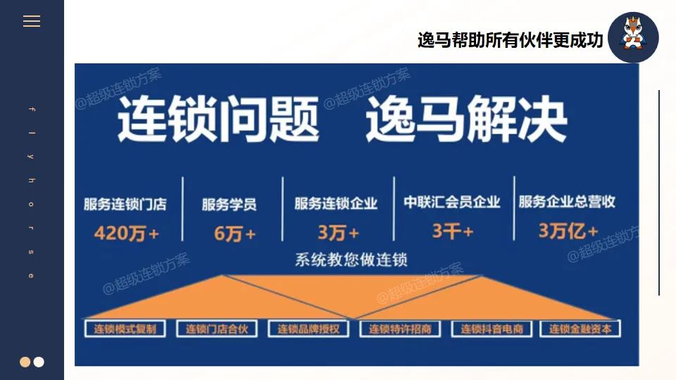 逸马连锁产业集团专注连锁产业研究与服务22年,本着“终生伙伴、幸福一生”的经营理念,聚焦战略陪跑服务,十大系统板块业务为其重磅赋能:连锁培训、连锁咨询、品牌授权、连锁+服务、产教融合、数智商业化中心、政企中心、中 联汇海外、投资中心、百亿教练中心等。选择优秀企业,进行战略陪跑,帮助所有伙伴更成功。