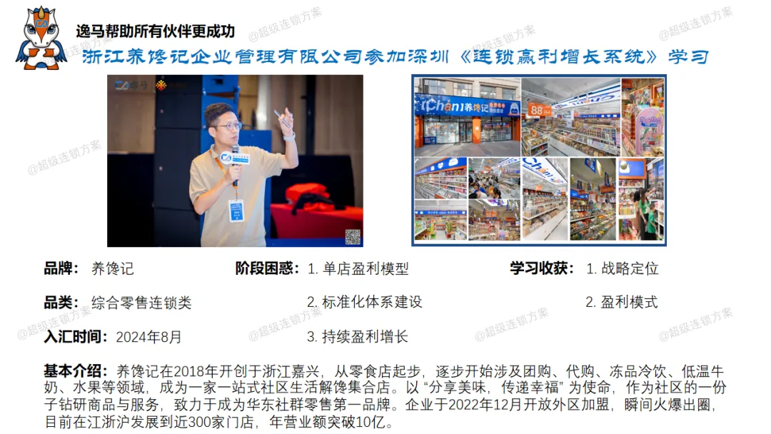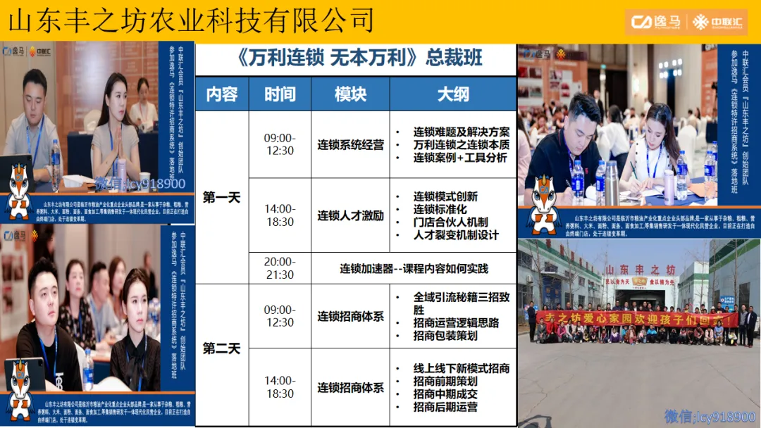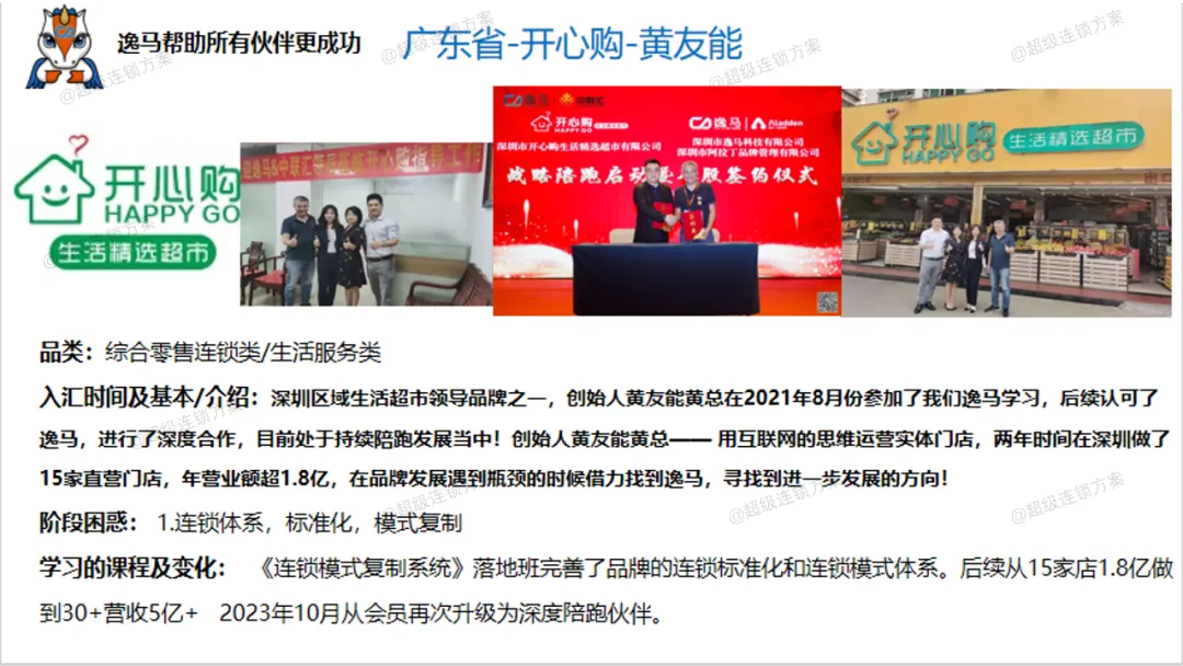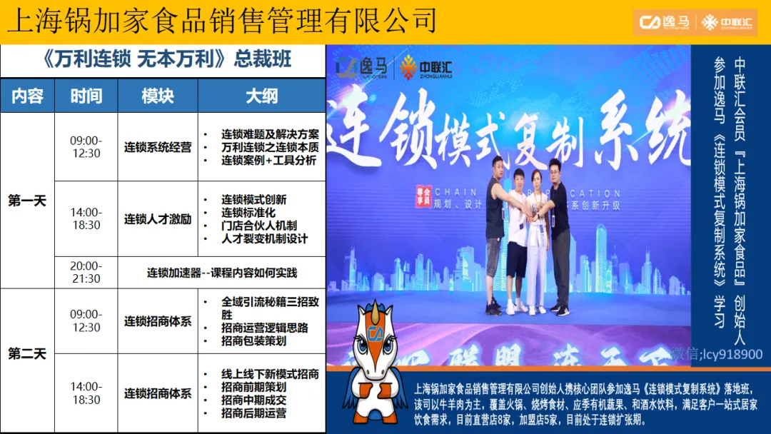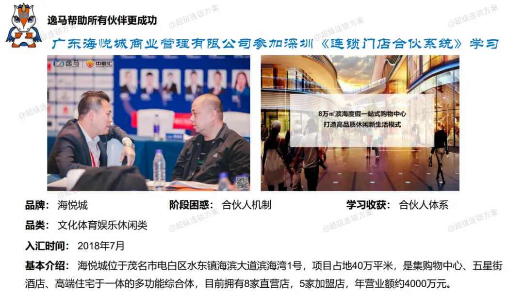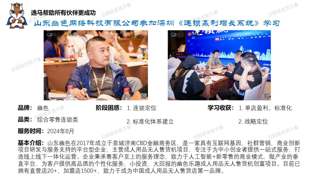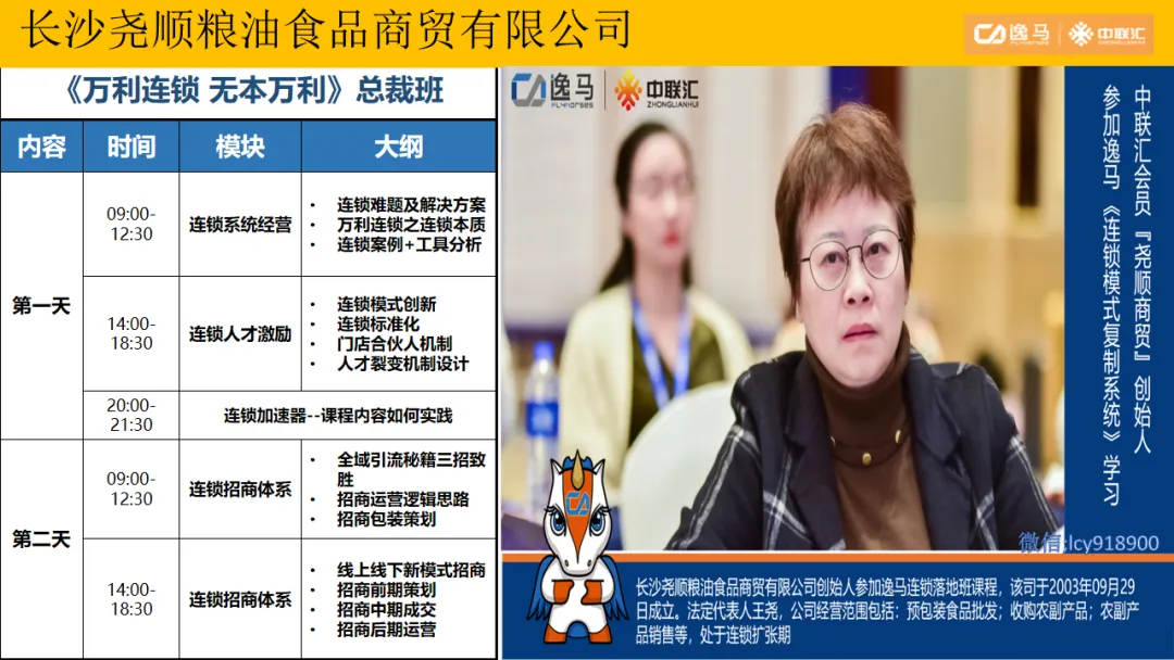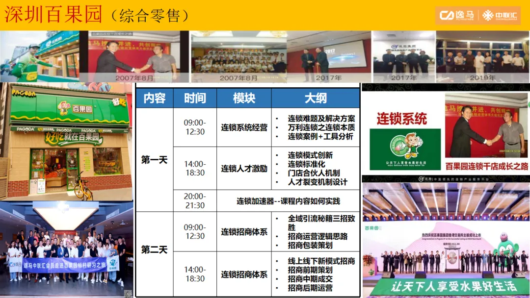 逸马连锁产业集团专注连锁产业研究与服务22年,本着“终生伙伴、幸福一生”的经营理念,聚焦战略陪跑服务,十大系统板块业务为其重磅赋能:连锁培训、连锁咨询、品牌授权、连锁+服务、产教融合、数智商业化中心、政企中心、中 联汇海外、投资中心、百亿教练中心等。选择优秀企业,进行战略陪跑,帮助所有伙伴更成功。