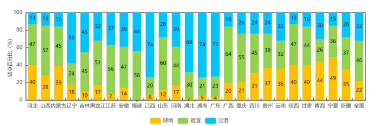 附图2 4月11日分省20厘米土壤墒情统计(站点百分比)