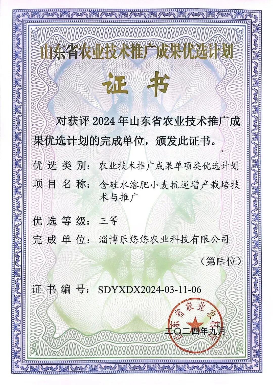 “含硅水溶肥小麦抗逆增产栽培技术与推广”获评山东省农业技术推广成果单项类优选计划