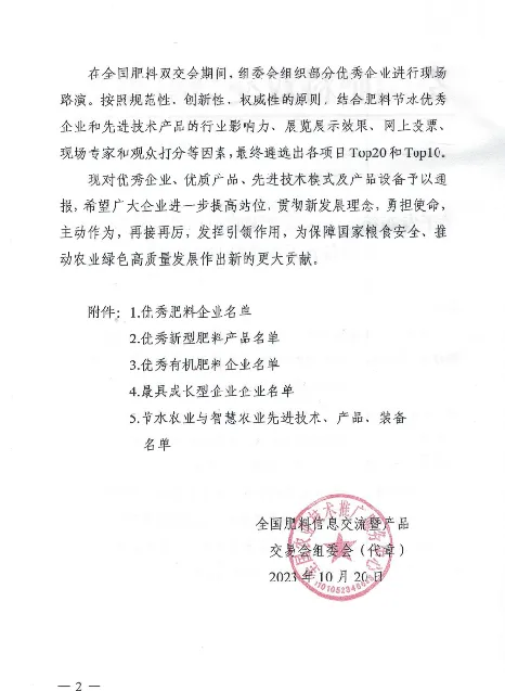 2023年9月,公司与中国农业科学院数字农业农村研究院(淄博)共建新型肥料与作物风味调控联合实验室。实验室聚焦逆境营养学,以逆境营养理论和逆境作物调控产品开发为主要业务内容,开展盐碱地、重金属污染、干旱低温、病虫害等逆境条件下作物生理响应及调控理论与方法研究,以及非显著逆境环境条件下大面积产量与品质均衡提升方案构建。“含硅水溶肥”农肥(2022)准字18667号获得“第二十四届全国肥料双交会”优秀新型肥料产品TOP100