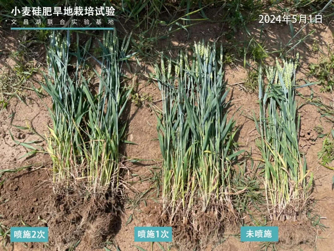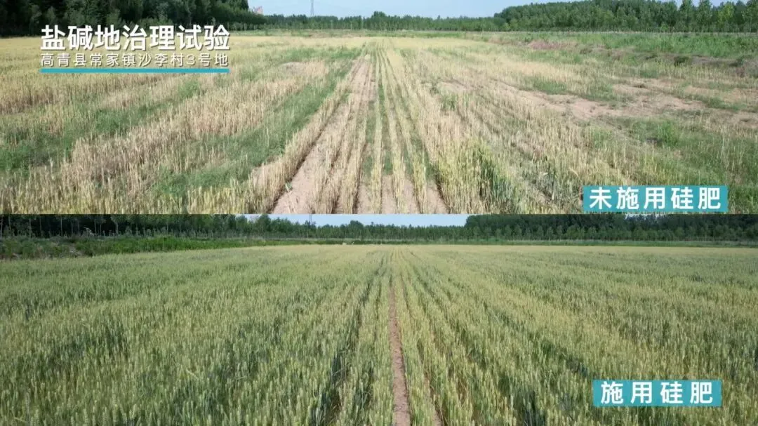 增产效果显著。经协调部、省、市、县四级涉农权威机构专家独立测产,2023-2024年山东、河南、安徽、江苏、新疆等30余处示范点评价实验结果表明,喷施硅肥的小麦根系发达、次生根增加,分蘖增加、春季分蘖有效成穗,基部节间缩短、茎秆粗壮,抗倒伏能力增强,叶片与秸秆夹角变小,叶绿素含量显著提高,抗逆、抗病虫害能力显著增强,灌浆期延长3-5天,亩穗数、穗粒数及千粒重都有不同程度的提高,增产效果显著。2023年各示范点喷施3次,增产幅度9.51%-33.3%,平均增幅18.51%;2024年各示范点喷施2-3次不等,增产幅度8.54%-21.6%。高青和临沂3处水稻增产幅度为9.18%-53.52%,淄博、潍坊、济宁、公主岭7处玉米增产幅度为9.16%-16.93%。