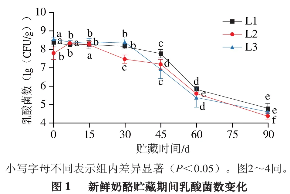 如图1所示,新鲜奶酪中的乳酸菌数随贮藏时间延长总体呈下降趋势。贮藏前15 d内下降趋势相对平缓,且L2组呈小幅上升趋势,表明L2组添加的乳酸菌在新鲜奶酪基质中仍具有一定的增殖能力;贮藏15 d后则进入快速衰减期,贮藏45~90 d,L1组乳酸菌数高于其他2 组。这种动态变化与新鲜奶酪的贮藏特性密切相关:贮藏前期,新鲜奶酪中丰富的乳糖、蛋白质等营养物质可为乳酸菌提供良好的生长环境;随着贮藏时间延长,营养底物逐渐消耗,同时代谢产物积累导致环境酸化,最终促使乳酸菌进入衰亡期。