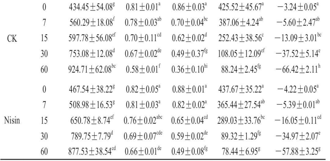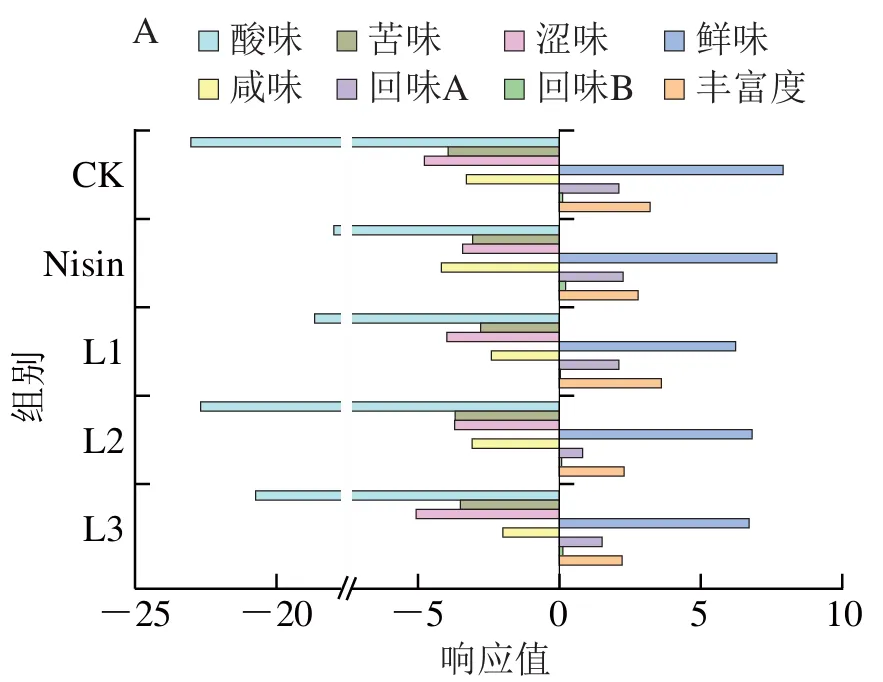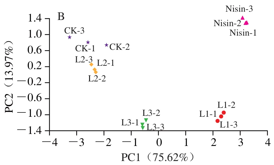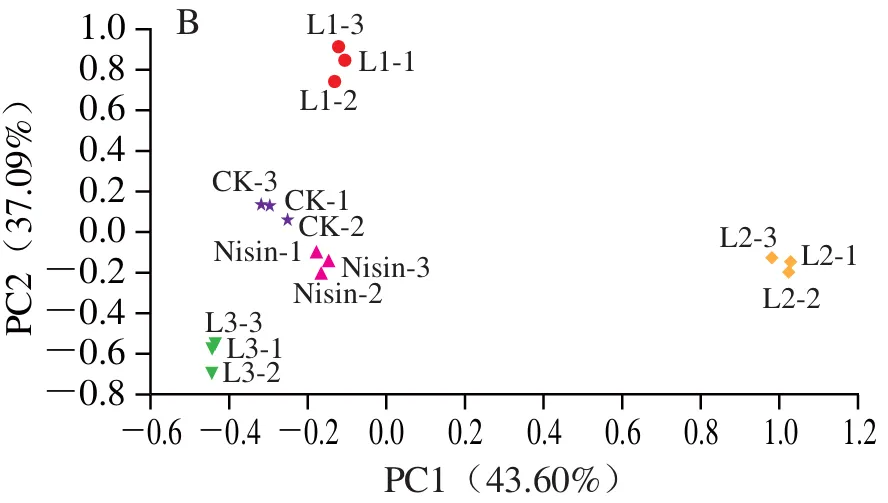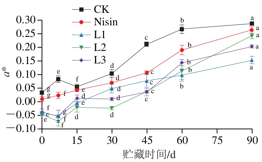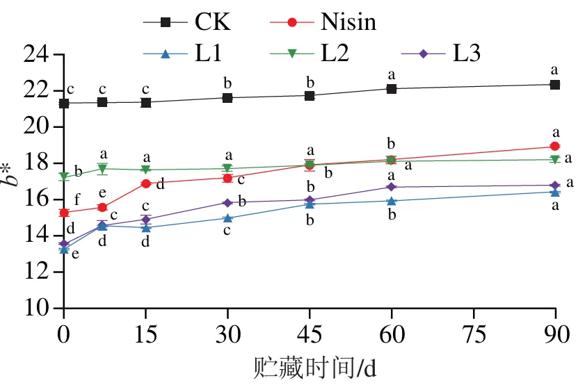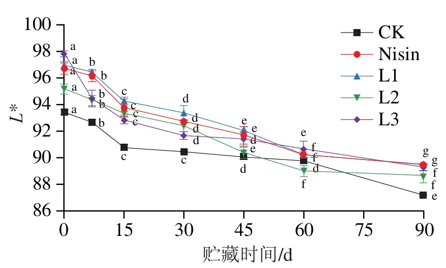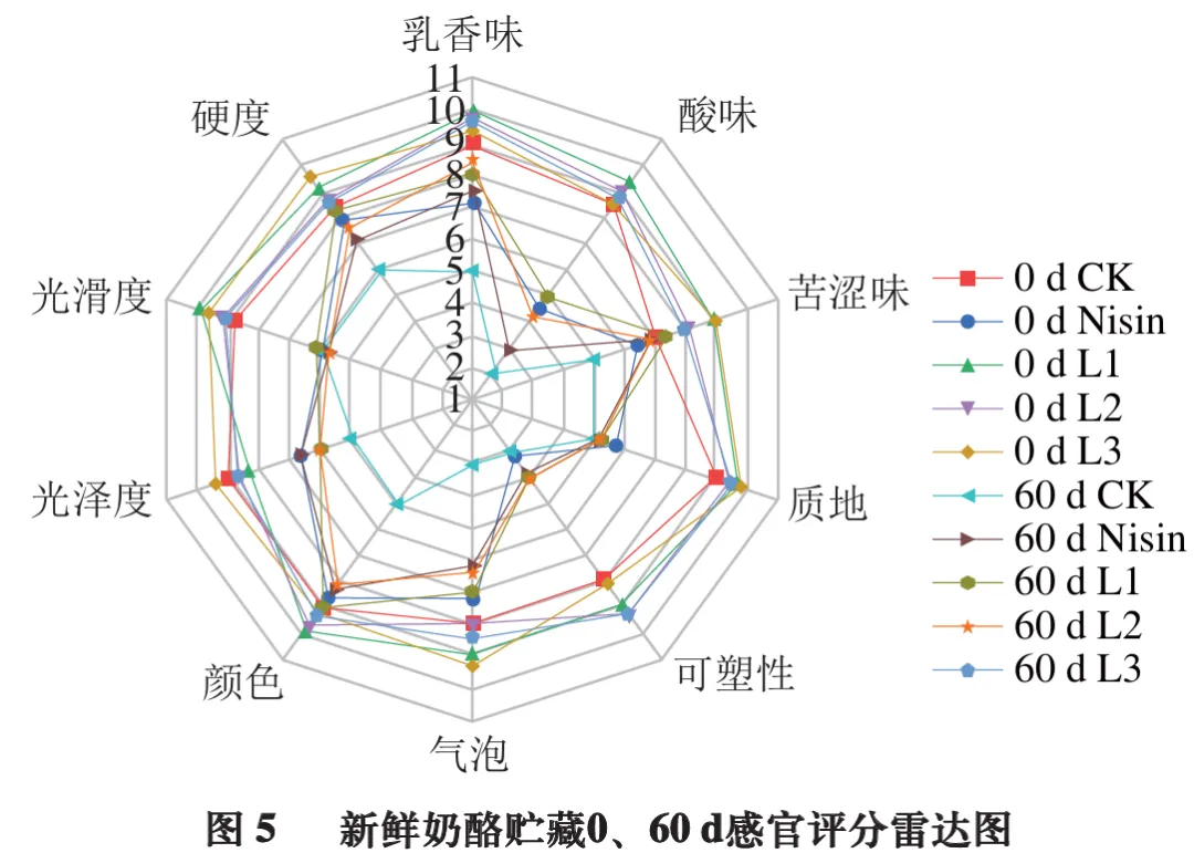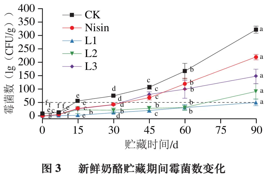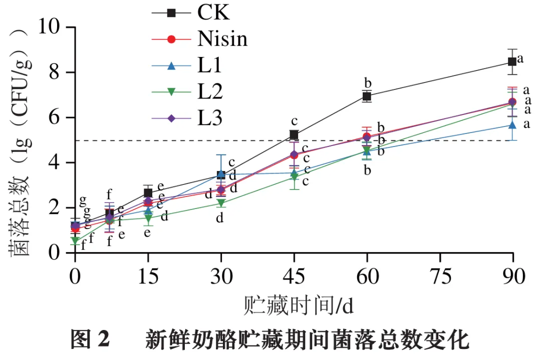 由图2可知,贮藏期间,各组新鲜奶酪菌落总数总体呈上升趋势。贮藏15 d内,各组菌落总数变化趋势均相对平缓,组间差异不明显;贮藏15 d后,微生物进入快速增殖期,菌落总数呈明显上升趋势。相比CK组,乳酸菌组与Nisin组菌落总数增长较为缓慢。贮藏60 d时,CK组、Nisin组与L3组菌落总数显著高于L1、L2组(P<0.05);贮藏结束时,CK组菌落总数显著高于各乳酸菌组(P<0.05)。综上,添加抑霉乳酸菌可有效抑制新鲜奶酪中腐败微生物的生长繁殖,进而延长产品的货架期。