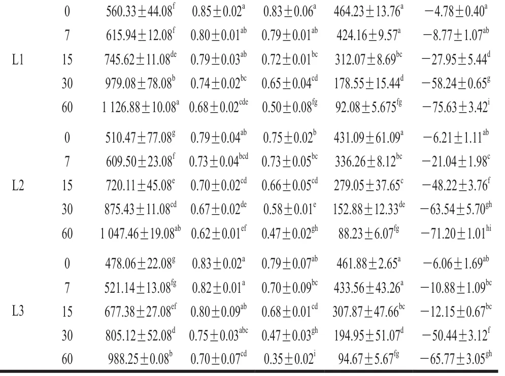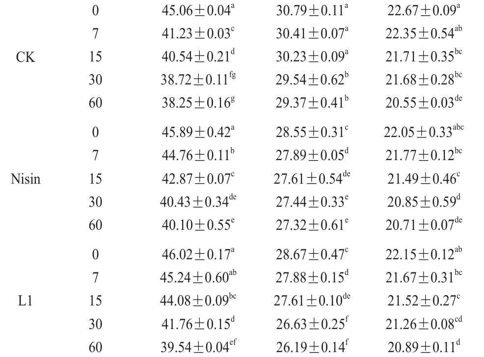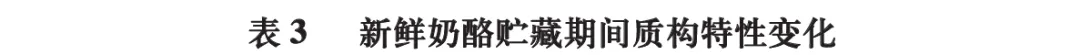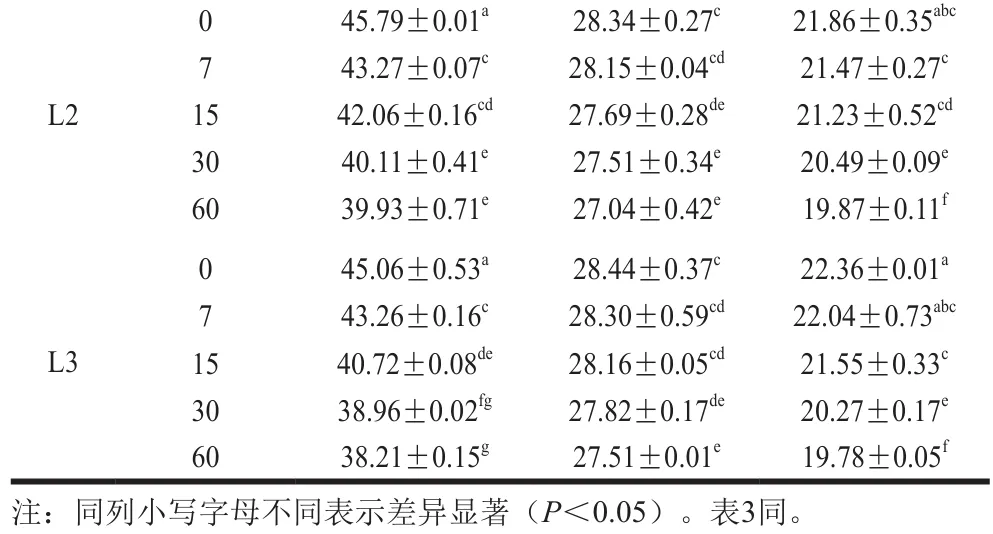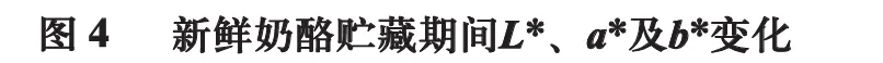 由表2可知,贮藏结束时,L1组、L2组新鲜奶酪水分含量显著高于CK组(P<0.05),而L3组与CK组无显著差异(P>0.05);乳酸菌组蛋白质和脂肪含量普遍低于CK组。这表明乳酸菌代谢诱导了更为剧烈的蛋白水解与脂肪水解作用,该过程是奶酪风味与质构得以改善的化学基础,这与Amiri等的研究结论一致。随着贮藏时间的延长,各组新鲜奶酪水分、蛋白质和脂肪含量均呈下降趋势。奶酪中的水分含量与微生物活动关系密切,水分含量越低,越不利于微生物生长繁殖。