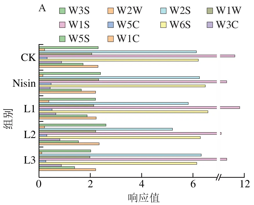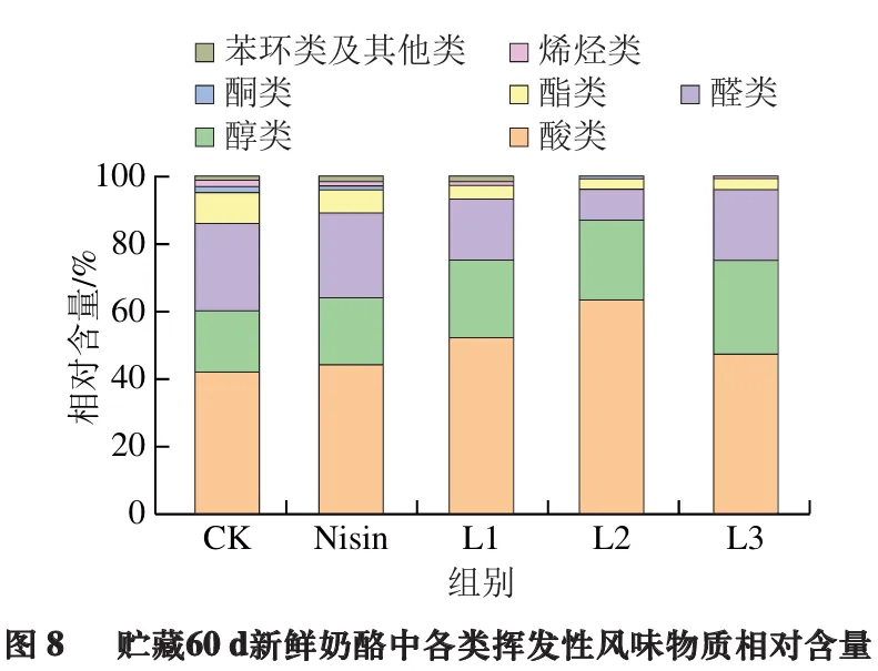 由图8可知,添加抑霉乳酸菌的新鲜奶酪中,挥发性风味化合物相对含量由高到低为:酸类>醇类>醛类>酯类>酮类>烯烃类>苯环类及其他类,其中,L2组新鲜奶酪中酸类物质相对含量最高,达61.34%。5 组样品中共检出114 种挥发性成分,包括13 种烯烃类、12 种醛类、17 种酮类、15 种醇类、16 种酯类、23 种酸类和18 种苯环类及其他化合物,其中L1组种类最多,达66 种。其中,以2-戊酮、乙酸乙酯、乙酸和丁酸占主导地位,乙醛、2-甲基丙醛和苯乙醛相对含量也较高,尤其是乙醛可赋予奶酪刺激性果香。在关键风味物质积累方面,乳酸菌组展现出显著优势。酸类物质中,乳酸菌组乙酸与丁酸相对含量远高于CK组;醇类物质中,乳酸菌组检出苯乙醇(花果香)和2,3-丁二醇(奶油香气),而CK组未检出这2 种物质;酯类物质中,乙酸乙酯在L1组和L2组相对含量较高;酮类物质中,甲基酮在乳酸菌组含量较高,其主要由酰基脂质经微生物降解生成,其形成涉及三酰基甘油酶解及游离脂肪酸降解,是半软干酪中重要的风味成分;2-戊酮和丁二酮相对含量在L2组尤为突出,其中,丁二酮可赋予奶酪独特香气。此外,乳酸菌组还检出多种CK组未检出的关键风味组分,如δ-十二内酯、9-十六碳烯酸等,这些物质可能直接源于乳酸菌代谢活动,能够丰富奶酪的风味层次。综上所述,添加抑霉乳酸菌的新鲜奶酪在风味物质丰富度与含量上均优于CK组。