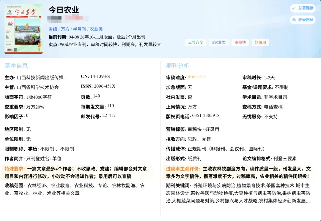 过稿率主观评价: 主收农林牧副渔方向,稿件质量一般,刊发量大,文章多为文字稿件,撰写难度不大,过稿率高,农业相关的稿件闭眼投!