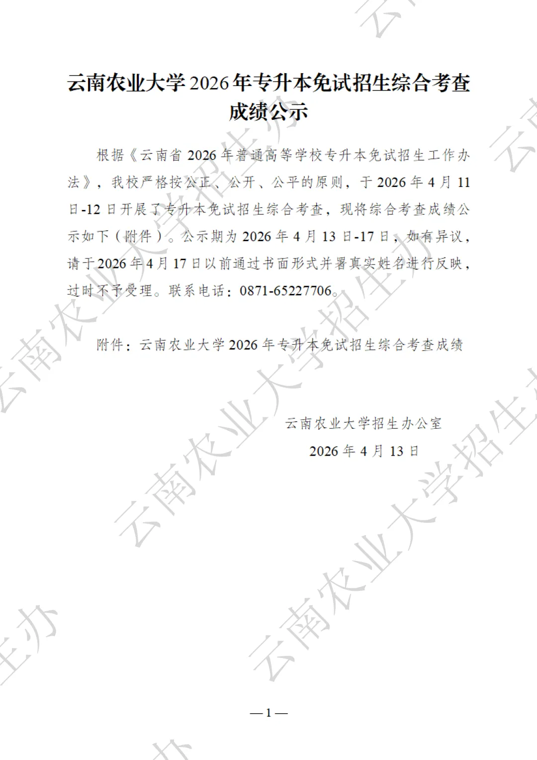 云南农业大学2026年专升本免试招生综合考查成绩公示