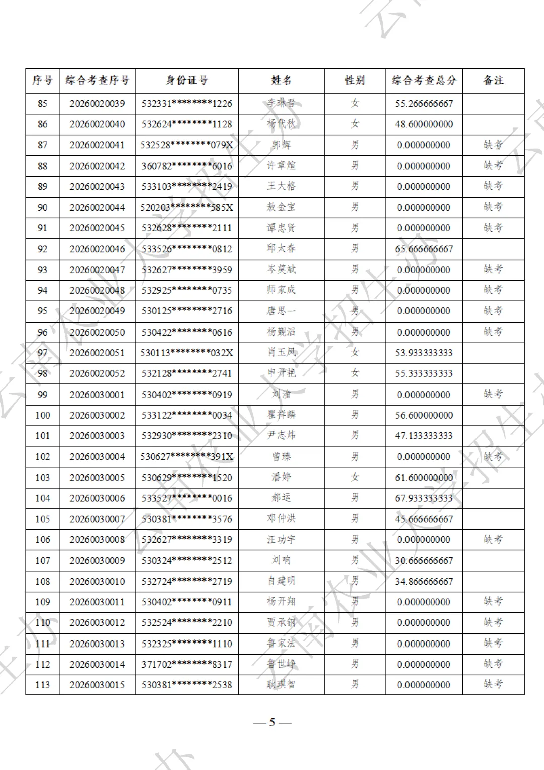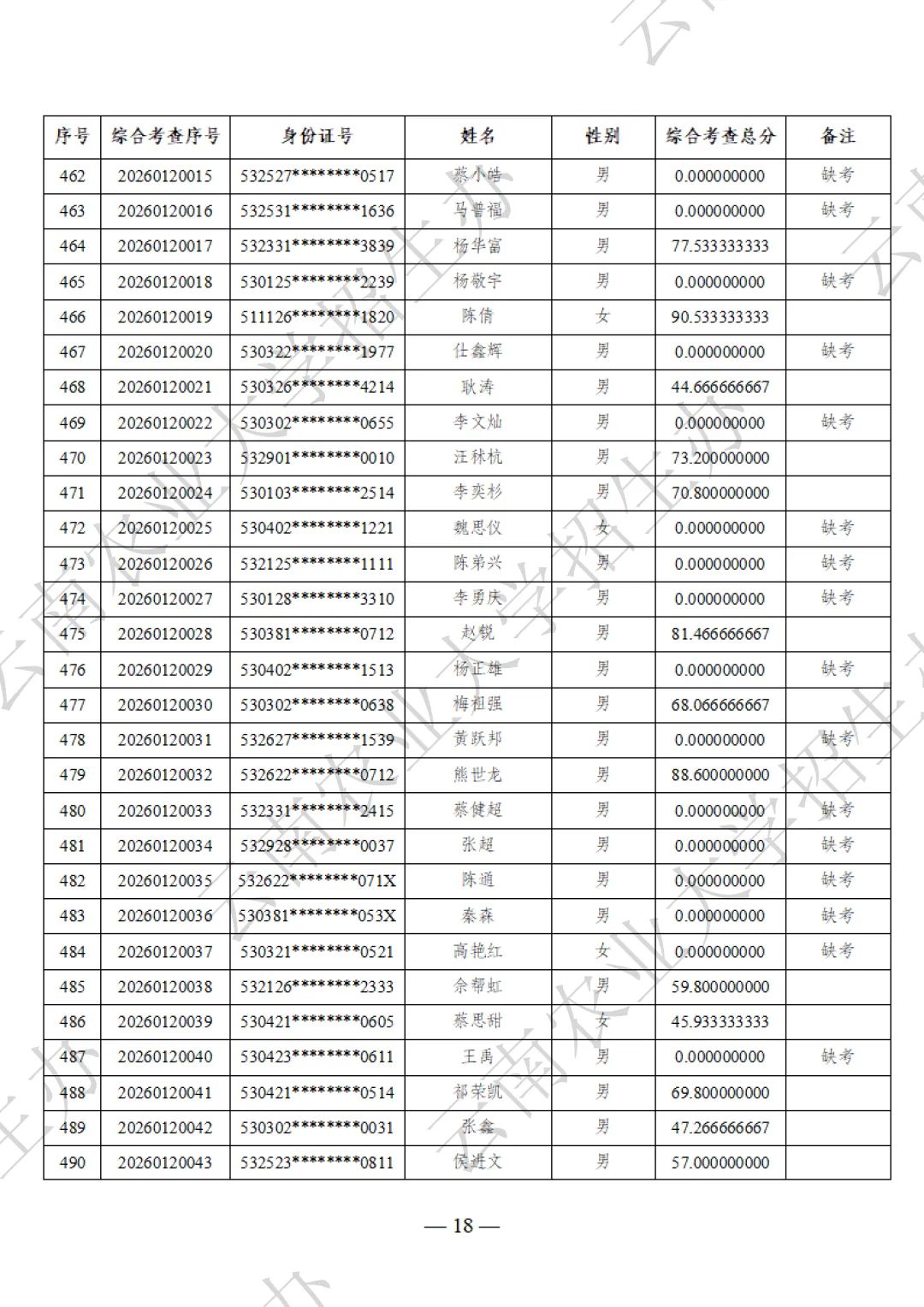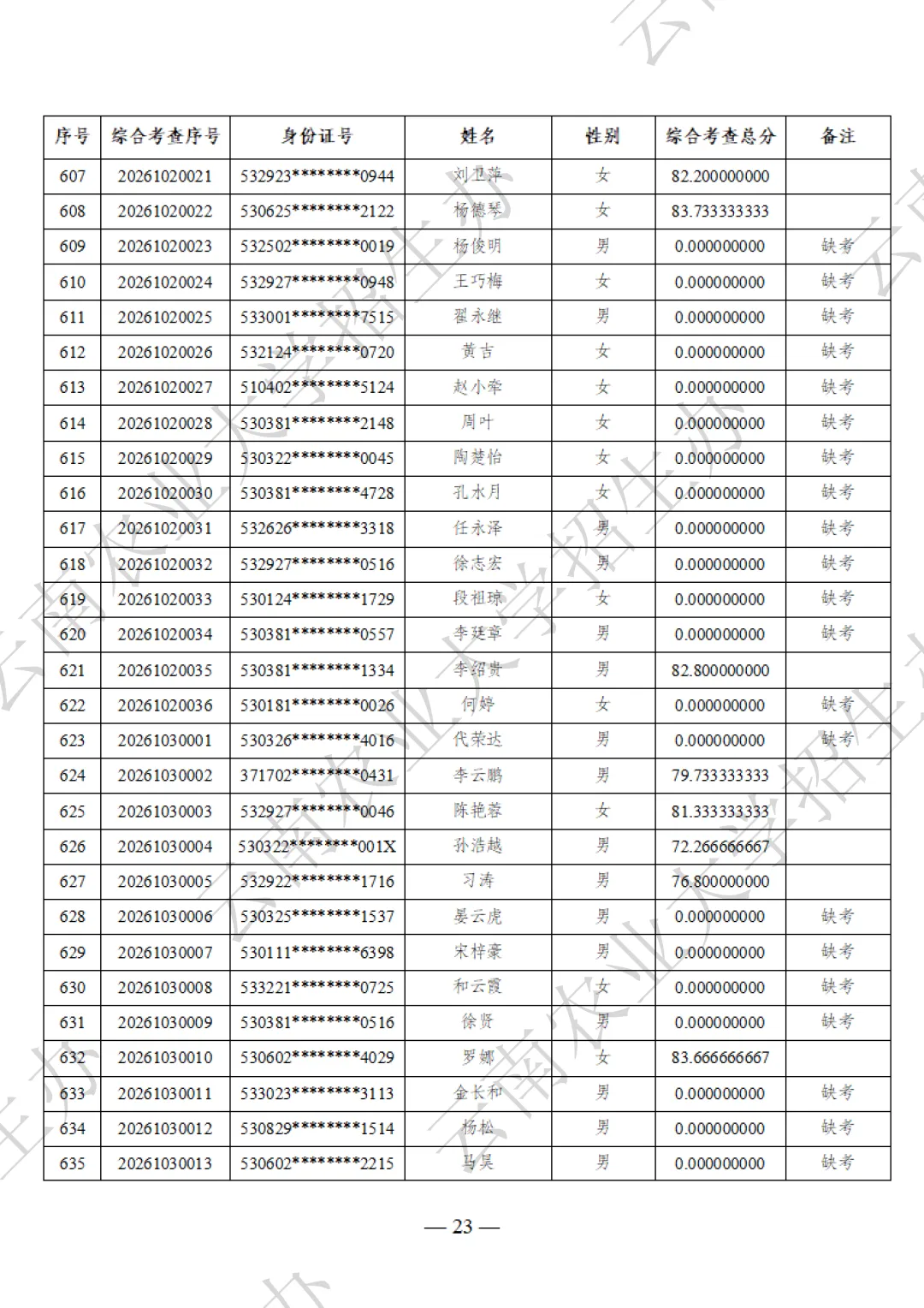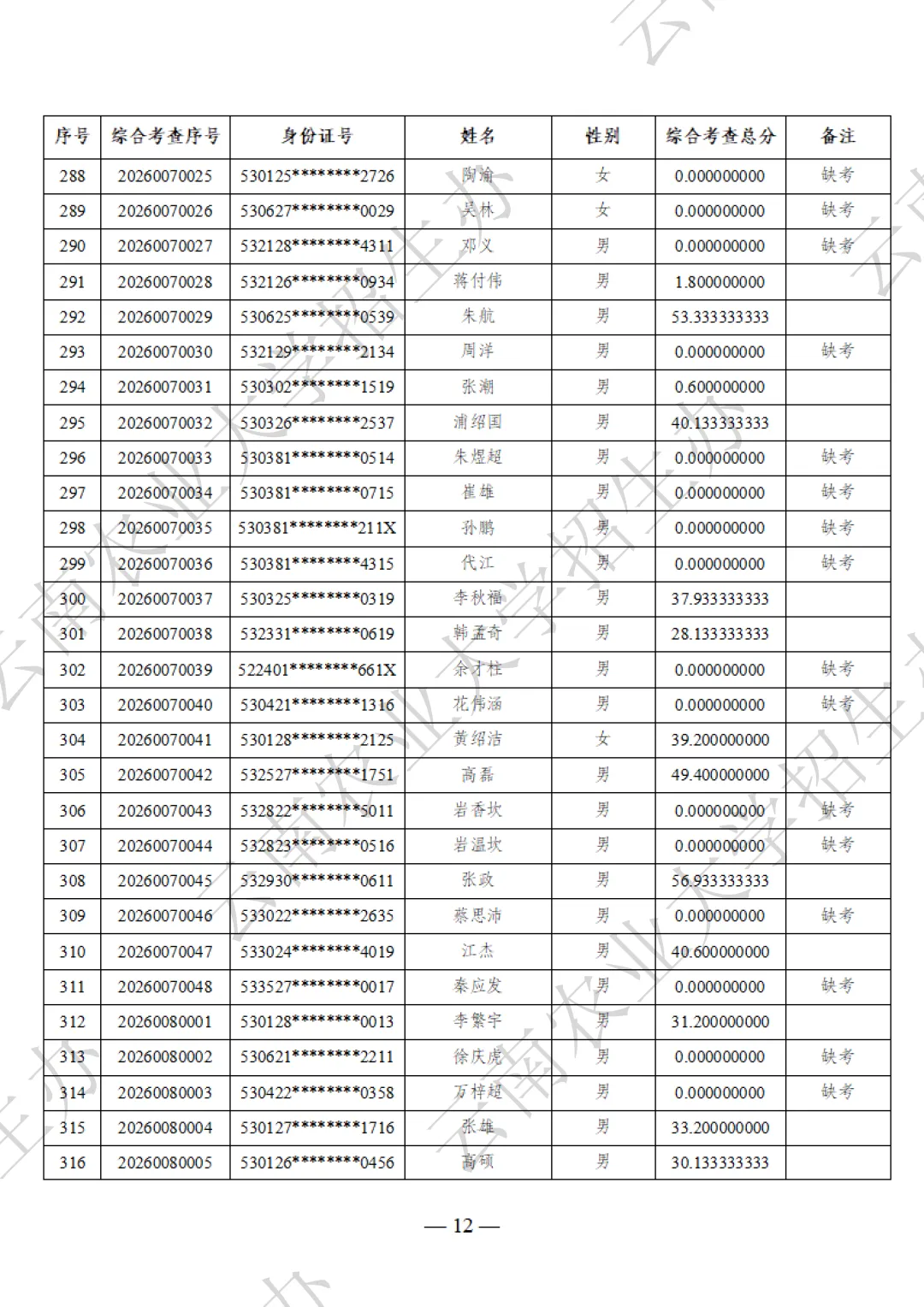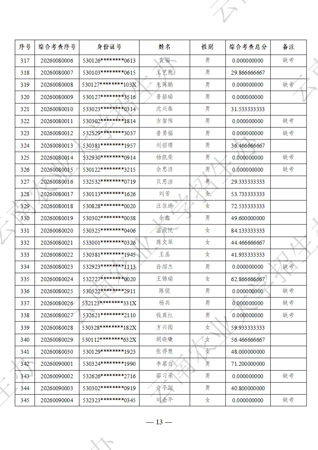 >云南农业大学2026年专升本免试招生综合考查成绩公示