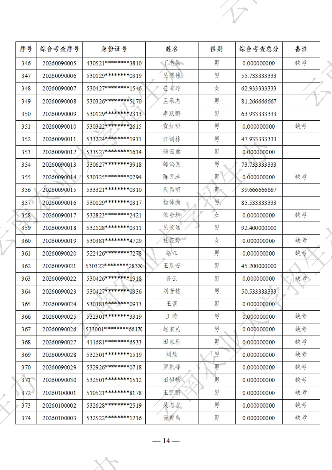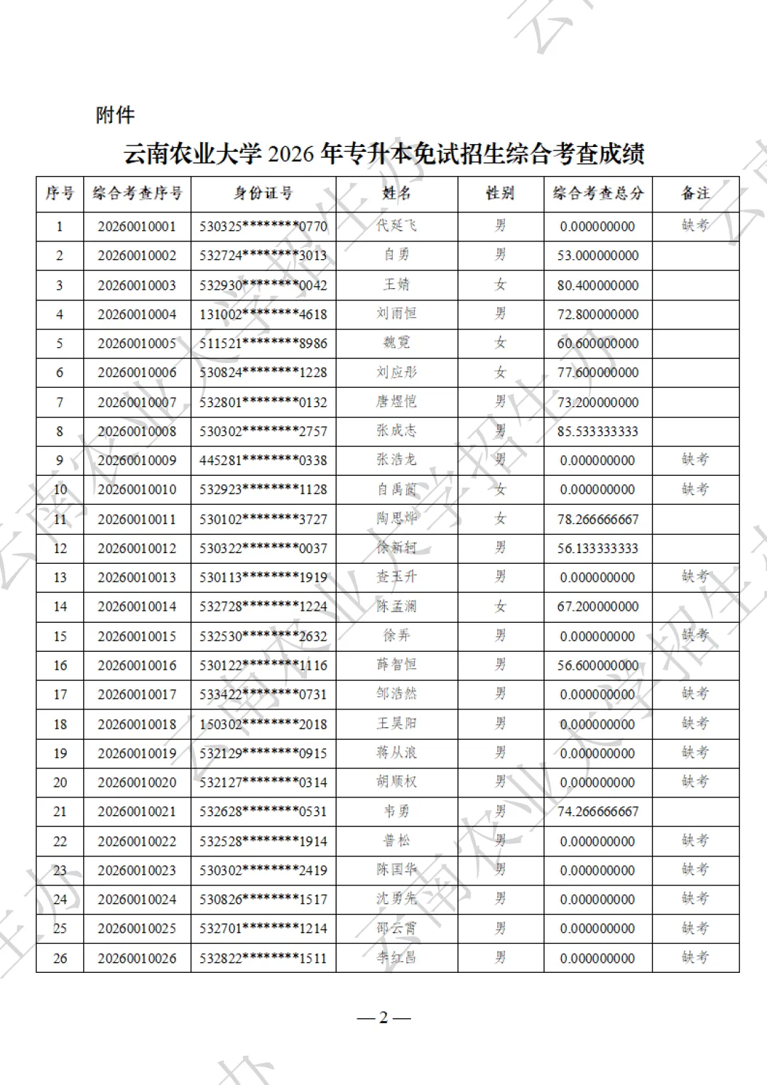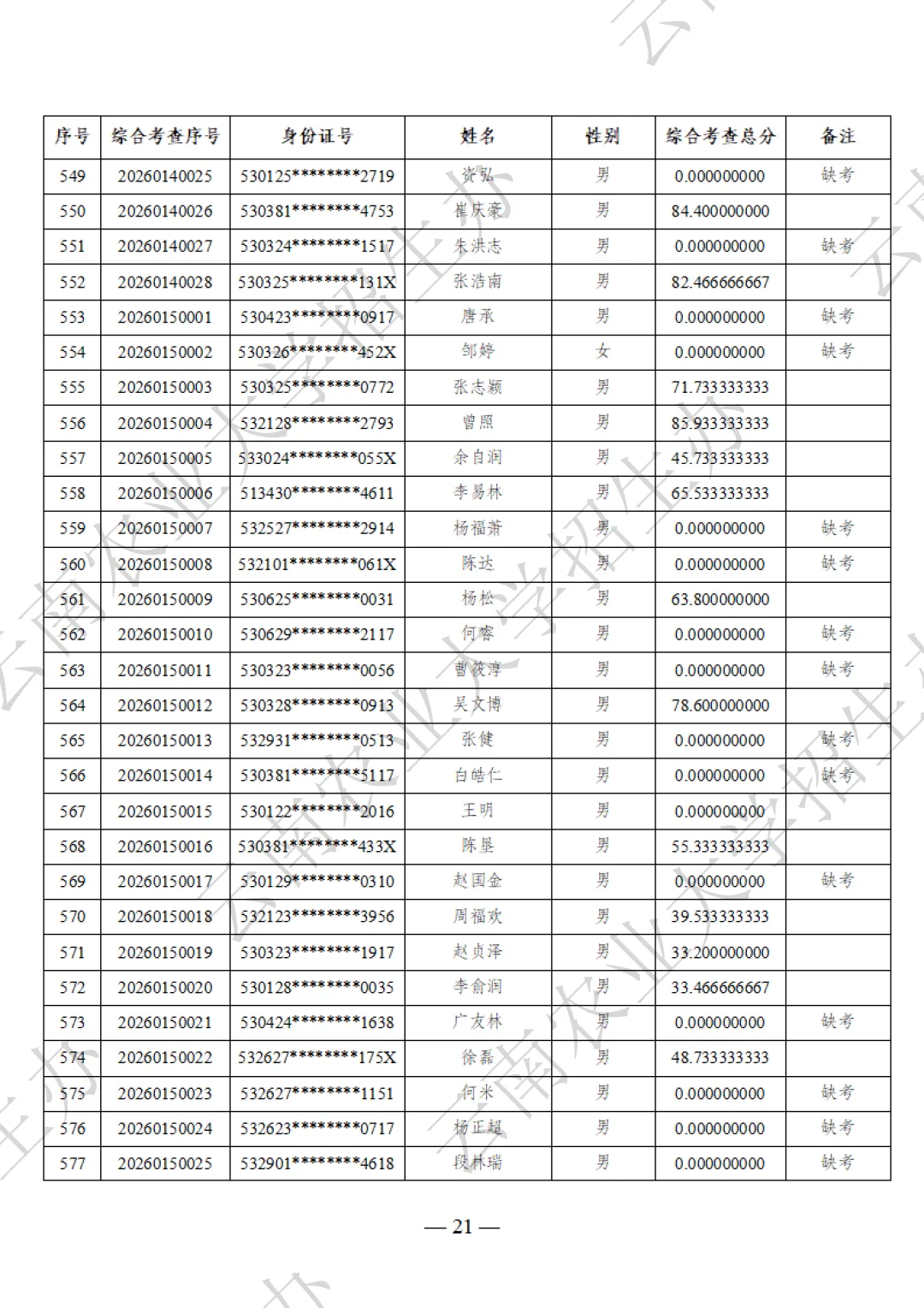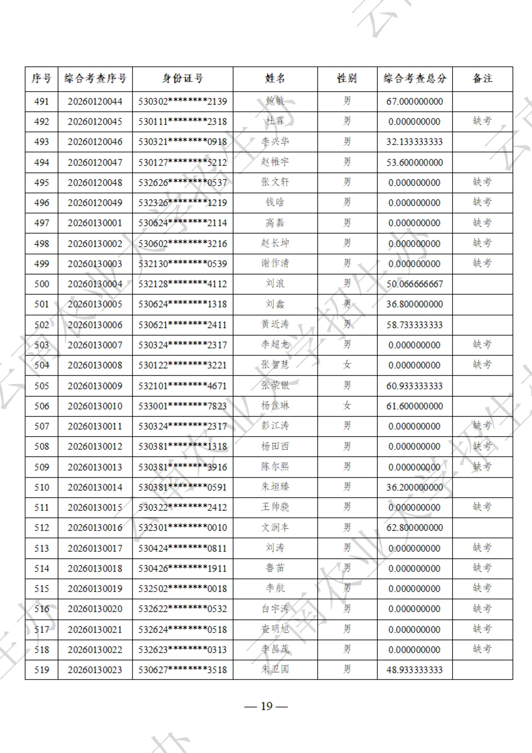 >云南农业大学2026年专升本免试招生综合考查成绩公示