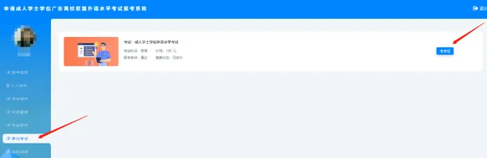 第二步:在左方菜单栏选择【参加考试】→点击右方【准考证】按钮