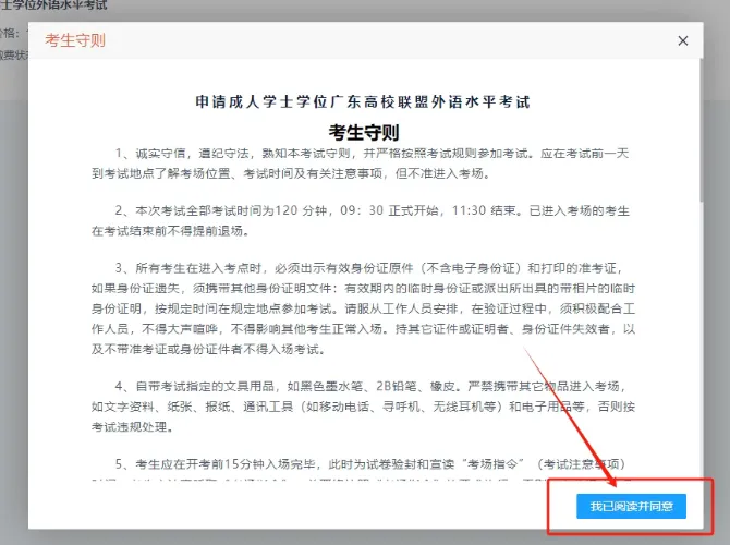第三步:阅读考生守则→点击右下角【我已阅读并同意】
