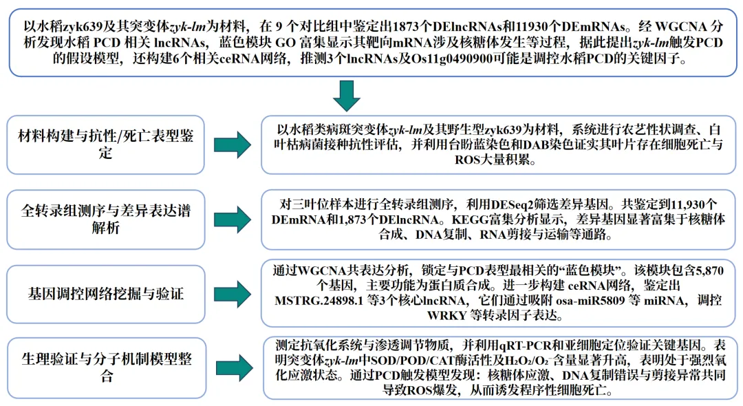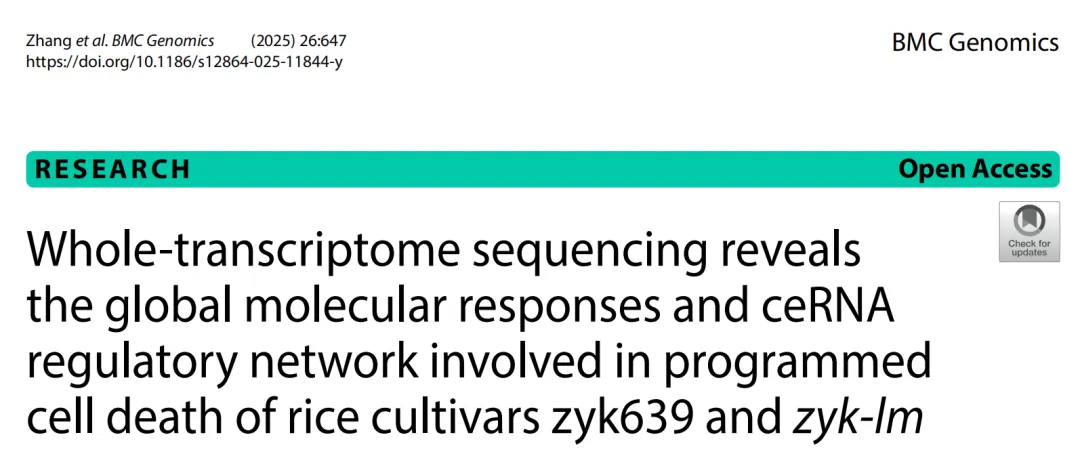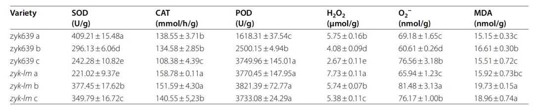 已有研究表明,植物中ROS和H₂O₂的过量积累可引发PCD。因此,本研究通过检测zyk639和zyk-lm中的过氧化物含量、抗氧化酶活性及渗透调节物质含量,探究水稻PCD中的抗氧化系统变化。如表1和表2所示,zyk639与zyk-lm不同叶位的抗氧化酶活性和渗透调节物质含量存在显著差异(p<0.05):zyk-lm的SOD、POD、CAT活性及MDA含量均高于zyk639,且zyk-lmb的抗氧化酶活性高于zyk-lma和zyk-lmc;O₂⁻和H₂O₂含量变化趋势与抗氧化酶活性基本一致;zyk-lma的脯氨酸含量为35.97μg/g,显著高于其他样本,分别是zyk-lmb的2.22倍、zyk639c的2.13倍;而zyk639的可溶性蛋白含量高于zyk-lm,其中zyk639a的可溶性蛋白含量是zyk-lmc的1.44倍;zyk-lmb的可溶性糖含量最低,为17.92mg/g(表2)。