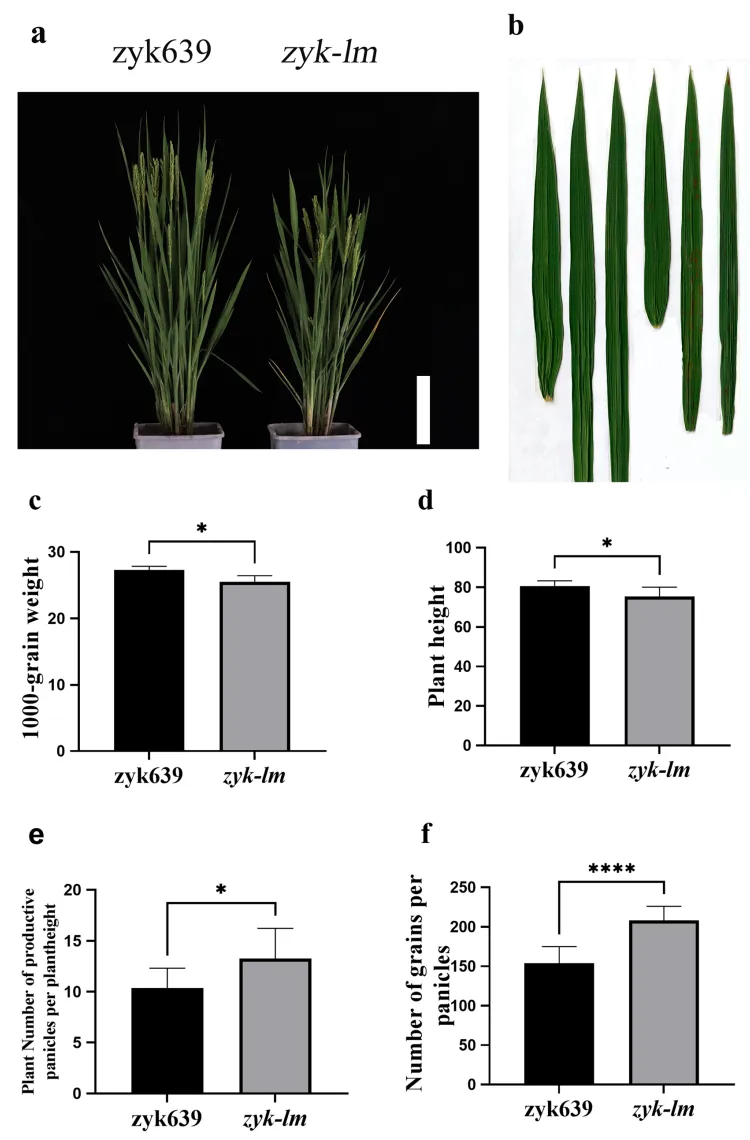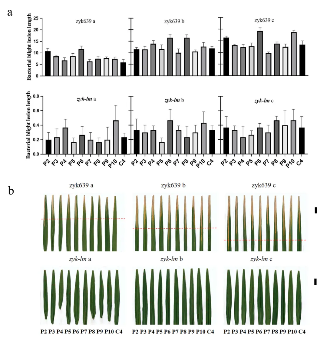 图1.野生型(zyk639)与突变体(zyk-lm)的植株形态及农艺性状比较。a,成株期植株表型。白色标尺=20厘米。b,成株期叶片表型。黑色标尺=2厘米。每组图像从左至右依次为:左侧3片叶分别为zyk639的旗叶、倒二叶、倒三叶;右侧3片叶分别为zyk-lm的旗叶、倒二叶、倒三叶。黑色标尺=2厘米。c,千粒重。d,株高。e,单株有效穗数。f,每穗粒数。数值为10株植株的平均值±标准差(SD),**表示在p<0.01水平上差异极显著。对zyk-lm和zyk639接种10个(P2、P3、P4、P5、P6、P7、P8、P9、P10、C4)xoo菌株(Xanthomonas oryzae pv. Oryzae,水稻白叶枯病的病菌),观察并统计各叶位病斑长度(图2a)。结果显示,易感材料zyk639在接种P6和P10菌株后病斑较长,且病斑长度按旗叶、倒一叶、倒三叶的顺序递增(图2b);而zyk-lm在接种10个白叶枯病菌株后均未表现发病表型。