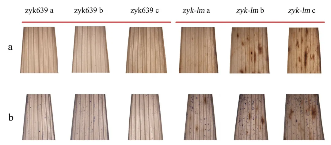 图2.野生型(zyk639)与突变体(zyk-lm)的抗病性比较。a,接种10个菌株后的白叶枯病病斑长度。b,3个叶片部位的发病表型。黑色标尺=2厘米。对三个叶位进行台盼蓝(TB)染色发现,与zyk639相比,zyk-lm叶片的蓝黑色斑点数量显著增加,且病斑周围叶肉区域也出现小蓝斑,表明zyk-lm病斑部位发生细胞死亡并影响周围细胞,且随着叶片衰老死亡现象加剧;而zyk639三个叶位几乎无蓝斑,说明其叶片未发生细胞死亡(图3a)。3,3’-二氨基联苯(DAB)染色结果显示,zyk639三个叶位均无明显褐色斑点,而zyk-lm叶片出现明显褐色斑点,且倒三叶的褐色标记大于倒二叶和旗叶(图3b),这与TB染色结果一致,推测可能是zyk-lm中ROS积累引发细胞PCD,进而导致类病斑表型。