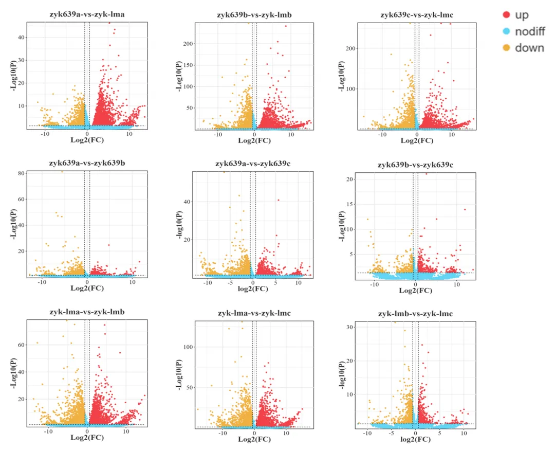 采用Illumina深度测序技术对18个叶片样本进行测序,主成分分析(PCA)显示重复样本间表达相关性较高,证实数据重复性良好,可支持后续分析。以P<0.05且FC≥1.5为筛选标准,共获得11,930个DEmRNAs(差异表达基因)。9个对比组(zyk639a vs zyk-lma、zyk639b vs zyk-lmb、zyk639c vs zyk-lmc、zyk639a vs zyk639b、zyk639a vs zyk639c、zyk639b vs zyk639c、zyk-lma vs zyk-lmb、zyk-lma vs zyk-lmc、zyk-lmb vs zyk-lmc)的DEmRNAs数量分别为4,478、7,199、7,170、1,566、2,307、981、6,640、7,416、1,779个,其中zyk-lma vs zyk-lmc组的DEmRNAs数量最多(图4a)。火山图显示,不同对比组中上调与下调基因的分布模式清晰(图4b)。
