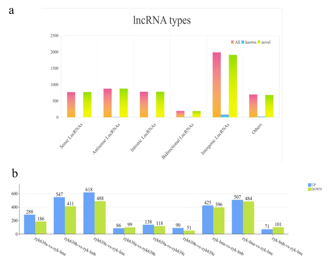 共鉴定出5,289个lncRNAs,包括95个已知lncRNAs和5,194个新预测lncRNAs。根据新lncRNAs在基因组上相对于蛋白质编码基因的位置,可将其分为5类:基因间区lncRNA(intergenic lncRNAs)、双向lncRNA(bidirectional lncRNAs)、内含子lncRNA(intronic lncRNAs)、反义lncRNA(antisense lncRNAs)、正义重叠lncRNA(sense overlapping lncRNAs)(图5a)。共获得1,873个DElncRNAs,在9个对比组中,zyk639c vs zyk-lmc组的DElncRNAs数量最多;除zyk-lmb vs zyk-lmc和zyk639a vs zyk639b组外,其余7个组的上调基因数量均显著多于下调基因(图5b)。
