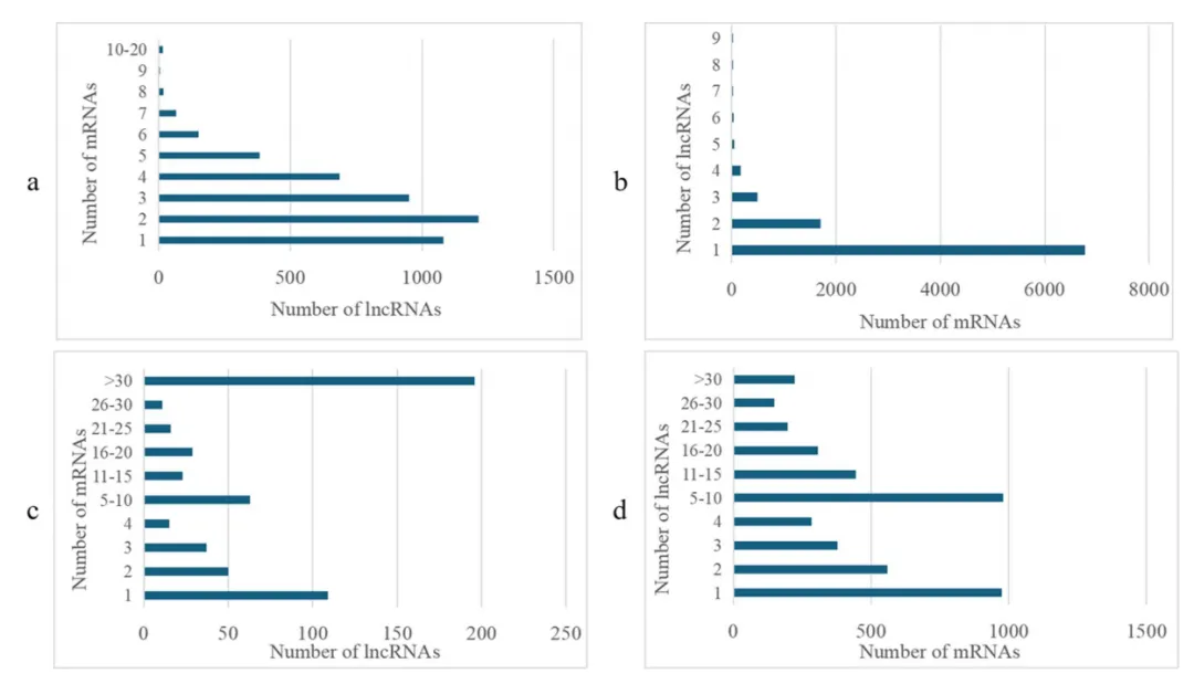 图6.长链非编码RNA(lncRNAs)的顺式(cis)和反式(trans)靶基因分析。a,与mRNA存在顺式(cis)关系的lncRNAs预测数量。b,与lncRNA存在顺式(cis)关系的mRNA预测数量。c,与mRNA存在反式(trans)关系的lncRNAs数量。d,与lncRNA存在反式(trans)关系的mRNA数量。