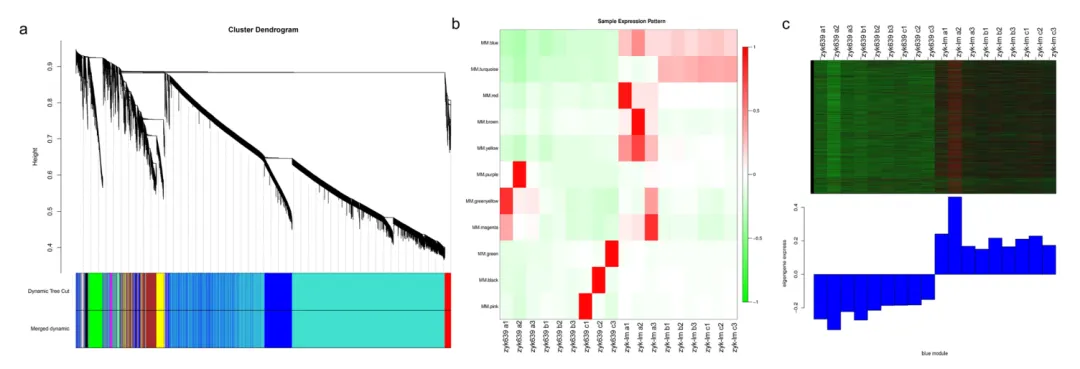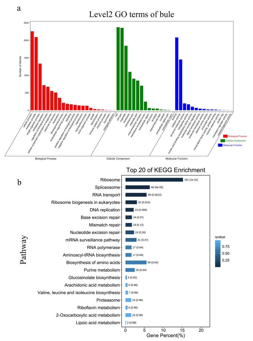 图7.zyk639与zyk-lm中鉴定基因的加权基因共表达网络分析(WGCNA)。a,基于拓扑重叠差异层次聚类得到的差异表达基因(DEGs)树状图。b,展示各模块中样本表达模式的热图。c,蓝色模块(module blue)中所有共表达基因的表达谱。颜色梯度代表Z值,柱状图代表该模块中对应共表达基因的共有表达模式。图8.蓝色模块中长链非编码RNA(lncRNA)靶向的共表达mRNA的GO富集分类与KEGG通路富集分析。a,mRNA在GO中显著富集(P<0.05)。b,涉及前20个术语的KEGG通路。Q值范围为0-1,Q值越接近0,富集程度越显著;Rich Factor值越大,表明富集程度越高。