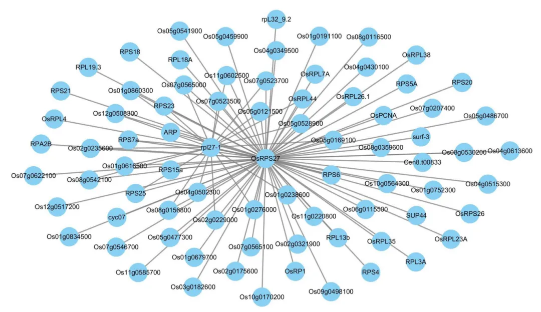 为进一步明确这些DEGs间的关系,构建基因共表达网络。选取蓝色模块中与核糖体合成和DNA复制相关的富集基因,绘制权重值前100的差异基因间关系图(图9)。该网络中,rpl27-1(Os08g0404300)、OsRPS27等关键基因在核糖体通路中显著富集。