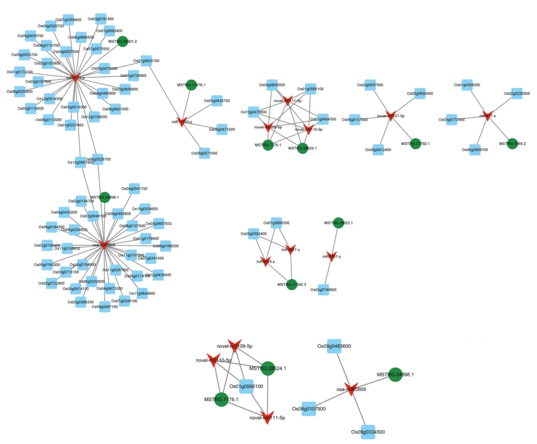取蓝色模块中的mRNA和lncRNA与DElncRNAs、DEmRNAs取交集,结合miRNA构建ceRNA网络(采用Cytoscape软件可视化)。共鉴定出101对调控关系,包括9个lncRNAs、11个miRNAs和76个mRNAs,构建8个复杂竞争关系网络(图10)。其中3个关键lncRNAs(MSTRG.24301.2、MSTRG.17476.1、MSTRG.24898.1)可分别结合miR8175-z、miR11033-z、osa-miR5809;MSTRG.21792.1可与novelm0237-5p协同调控Os02g0557000、Os03g0850400、Os06g0157000、Os08g0512400;MSTRG.5369.2可与miR477-x协同调控Os01g0308300、Os02g0220500、Os03g0773300、Os06g0609700;MSTRG.31242.3可与miR5225-z、miR3627-z协同调控Os05g0393400、Os07g0666300;MSTRG.16622.1可与miR5257-z协同调控Os03g0749800。值得注意的是,Os01g0566100基因可同时被MSTRG.7176.1和MSTRG.28624.1调控(图10)。此外,发现WRKY家族转录因子Os09g0334500和JMJ家族转录因子Os09g0483600可在MSTRG.24898.1与osa-miR5809结合后调控靶基因(图10)。