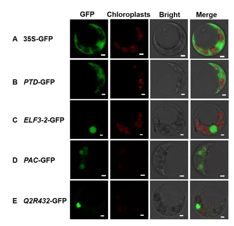 将预测的候选基因与GFP融合后转入水稻9311原生质体,通过激光共聚焦显微镜观察目标基因在细胞内的定位。构建4个差异基因(PAC,Os05g0393400;PTD,Os05g0588200;ELF3-2,Os01g0566100;Q2R432,Os11g0490900)的亚细胞定位载体,激光共聚焦显微镜观察显示:PTD定位于细胞质,ELF3-2定位于细胞核(图12),提示多个细胞器可能参与水稻PCD的触发与调控。