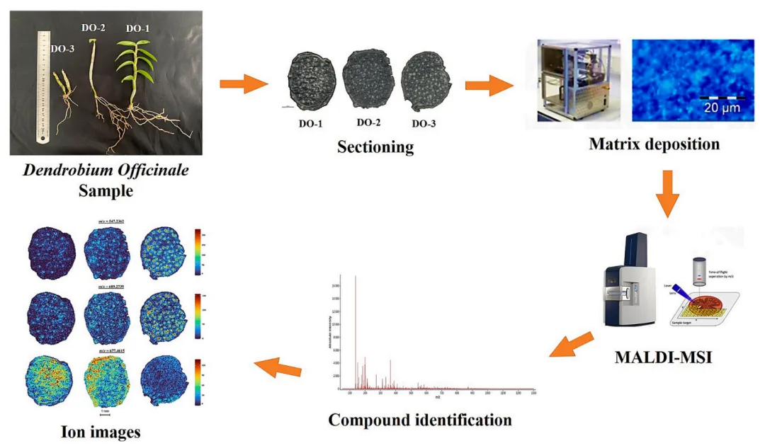铁皮石斛(Dendrobium officinale)是一种药食同源植物,其茎部富含多糖、生物碱和类黄酮等活性成分,具有广泛的药用和营养价值。然而,这些代谢物在不同生长年限和不同组织中的空间分布规律尚不明确。传统代谢组学方法无法保留空间信息,而MALDI-MSI技术将质谱分析与二维空间成像相结合,能够在无需复杂样品预处理的情况下,实现对样本中代谢物的定性定量分析以及空间分布可视化,为本研究提供了技术支撑。