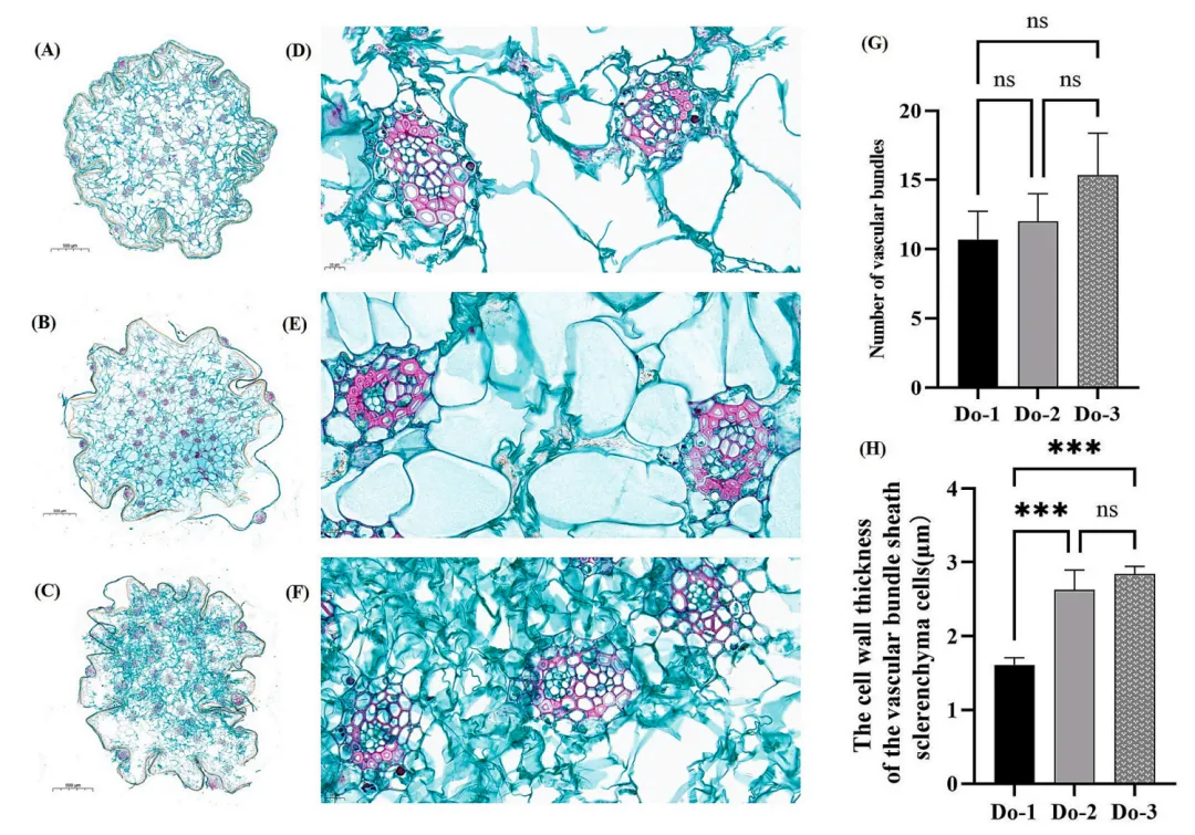 研究选取了不同生长年份(一年Do-1、两年Do-2和三年Do-3)的石斛新鲜茎样本,经固定、脱水、石蜡包埋等步骤后进行切片处理(图1)。随后对石斛茎切片进行番红-固绿染色分析,通过横截面观察,从外至内可见铁皮石斛茎的表皮、薄壁组织及散布其间的维管束(图2A-C)。染色结果显示,不同生长年限的铁皮石斛茎中维管束的数量和形态存在差异(图2D-F)。统计分析表明,随着植株年龄的增长,铁皮石斛茎中维管束的数量显著增加(图2G)。此外,统计结果还显示,随着年限的增加,维管束鞘中厚壁细胞的细胞壁厚度也显著增加(图2H)。值得注意的是,二年生茎样本(Do-2)的细胞壁厚度增加最为显著,这与其生长状态一致。需指出的是,二年生铁皮石斛茎处于生长高峰期,维管束密度的增加确保了植株各部分获得充足的水分和养分,以维持正常的生长发育。维管束厚壁细胞的细胞壁为厚壁组织细胞,其木质化细胞壁含有木质素和纤维素。这些物质的存在使维管束细胞壁极为坚韧,从而提供机械支撑和保护作用,使植株能够抵抗外部环境的压力并保持直立姿态。