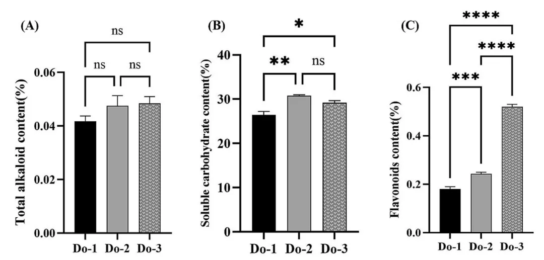 对不同生长年限铁皮石斛茎样品的生理指标(总多糖、生物碱及黄酮含量)分析结果表明,三年生样本中生物活性物质的积累更为显著。铁皮石斛茎中总生物碱含量范围为0.0396%至0.0512%(图3A)。不同生长年限的茎样本间总生物碱含量无显著差异。总多糖含量在一年生(Do-1)至二年生(Do-2)样本中介于25.854%至30.917%之间,三年生(Do-3)样本中略有下降(图3B)。一年生茎的多糖含量最低,而二年生与三年生茎间无显著差异。相比之下,总黄酮含量变化范围为0.17%至0.53%,且随生长年限增加呈现显著上升趋势(图3C)。