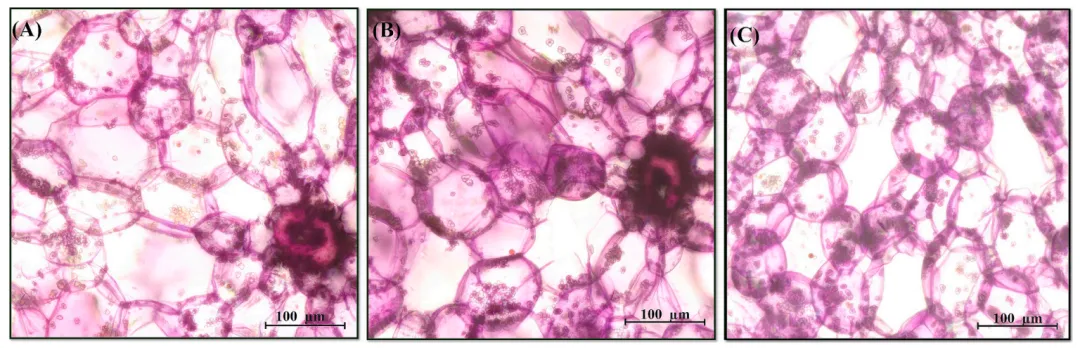 图3.不同生长年限铁皮石斛样本中总生物碱、总多糖和总黄酮含量的变化。(A)总生物碱、(B)总多糖和(C)总黄酮在铁皮石斛茎样本(Do-1、Do-2、Do-3)中的含量,数据来源于三次独立实验的重复测定。误差棒表示均值标准误(SEM)。显著性差异水平:*表示P<0.05,**表示P<0.01,***表示P<0.001,****表示P<0.0001;ns表示无显著差异(P≥0.05)。对不同生长年限铁皮石斛茎中多糖的PAS染色结果表明,多糖主要储存于基本组织的薄壁细胞中,并以颗粒形式分布(图4)。一年生铁皮石斛茎样本(图4A)中多糖颗粒数量较少且分布较为分散,而二年生和三年生样本中分布更为密集。二年生茎中多糖颗粒数量略有增加(图4B),三年生茎中则观察到更高密度的多糖分布,且颗粒呈聚集状态(图4C)。这些结果证明,铁皮石斛茎中多糖的分布与植株年龄呈正相关。