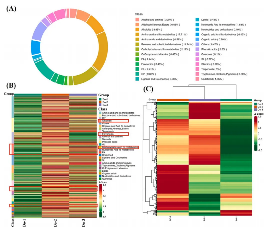 图4.铁皮石斛茎多糖的PAS染色切片。(A)一年生样本,(B)二年生样本,(C)三年生样本;图中比例尺为100μm。本研究采用基质辅助激光解吸电离质谱成像(MALDI-MSI)技术,对三年生铁皮石斛茎的横切面和纵切面样本进行分析。如图5A所示,共鉴定到1039种代谢物,其中碳水化合物占2.12%,生物碱占8.95%,类黄酮占3.46%。糖类、生物碱和类黄酮是铁皮石斛的主要药用成分,可作为其品质评价指标。本研究利用MALDI-MSI技术分析不同生长年限铁皮石斛茎中代谢物的变化,为确定最佳采收期提供依据。聚类热图分析显示,糖类、生物碱和类黄酮的含量随植株年限增加而上升(图5B)。一年生茎(Do-1)中这些代谢物水平低于二年生和三年生茎(Do-2和Do-3),虽无显著差异,但一定程度上反映了MALDI-MSI数据的可靠性。层次聚类将Do-2和Do-3归为一类(图5C),表明二者具有相似的代谢物组成和浓度,提示三年可能是铁皮石斛代谢谱趋于稳定的阈值。不同年限石斛茎的MALDI-MSI质谱图(图6)。