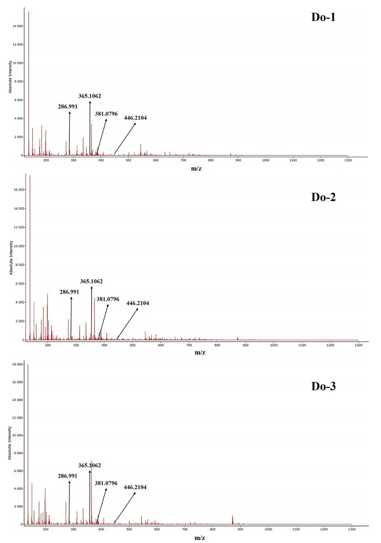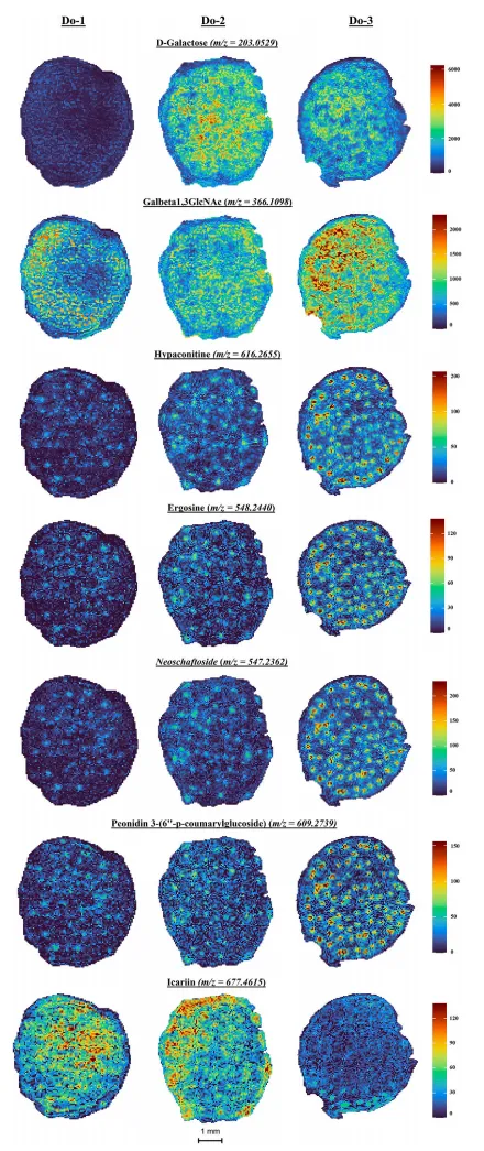 图5.不同年限石斛中代谢物类别的定量分类、聚类热图和代谢物双向相关性分析。(A)不同生长年限铁皮石斛中代谢物类别的定量分类。(B)样本(Do-1、Do-2、Do-3)中次生代谢物的聚类热图。颜色深浅表示相对含量高低,红色代表相对含量较高,绿色代表相对含量较低。(C)铁皮石斛样本(Do-1、Do-2、Do-3)中代谢物的双向相关性分析。颜色深浅反映代谢物间相关性程度,红色调表示较强的正相关,绿色调表示较强的负相关。图6.三年生铁皮石斛茎样本(Do-1、Do-2、Do-3)茎组织切片的代谢物MALDI-MSI质谱图。
