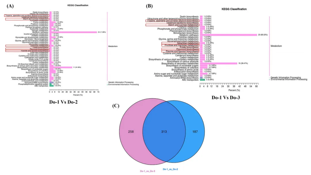 图7.(A)差异代谢物(DAMs)的KEGG富集分析。条形图展示了不同代谢通路及基因相关功能的百分比分布。红框标注的通路表示存在显著差异。(B)Do-1与Do-3样本的KEGG分类比较。与(A)类似,展示了KEGG百分比分布,红框标注的通路表示显著差异。(C)Do-1、Do-2和Do-3样本(Do-1 vs Do-3和Do-1 vs Do-2)的韦恩图,显示共有及特有代谢物。图中数字(258、313、187)代表特定样本组合中特有或共有的代谢物数量。新亚麻氰苷、海藻糖、纤维二糖和山奈酚在铁皮石斛茎中的空间可视化与分布