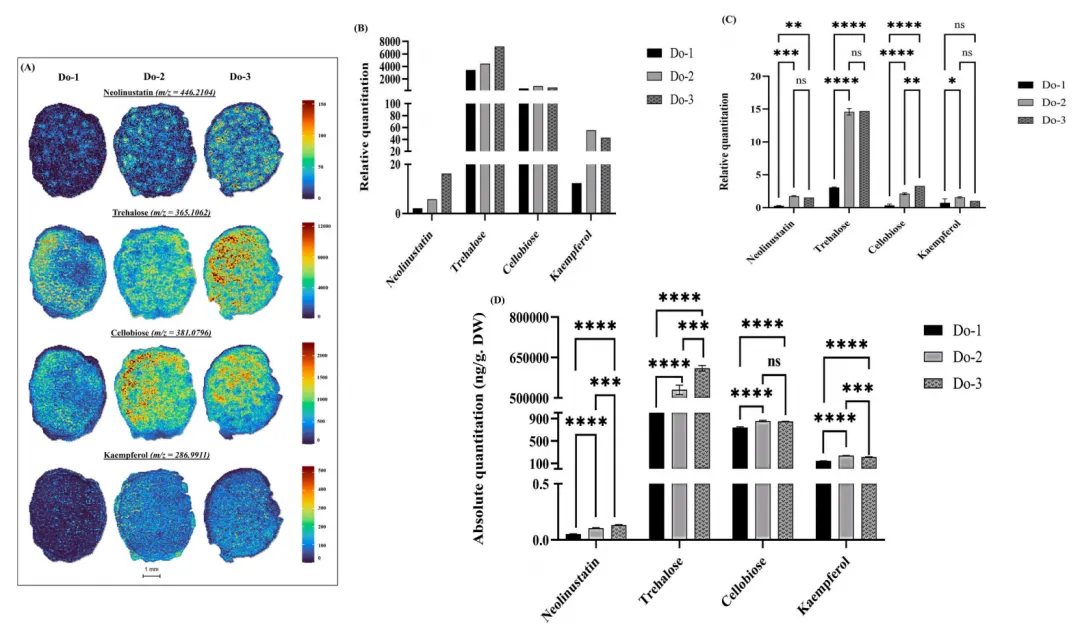 图8.石斛茎中新亚麻苦苷、海藻糖、纤维二糖和山奈酚的MALDI-MSI分析、LC-MS/MS分析和HPLC分析。(A)新亚麻氰苷(m/z 446.2104)、海藻糖(m/z 365.1062)、纤维二糖(m/z 381.0796)和山奈酚(m/z 286.9911)的MALDI-MSI分析;(B)通过离子迁移谱(IMS)测量提取的各代谢物相对含量;(C)通过LC-MS/MS测定的铁皮石斛茎(Do-1、Do-2、Do-3)中代谢物相对含量;(D)通过HPLC测定的铁皮石斛茎(Do-1、Do-2、Do-3)中代谢物绝对含量。图中比例尺为1-mm,误差棒表示均值标准误(SEM),显著性差异水平:*表示P<0.05,**表示P<0.01,***表示P<0.001,****表示P<0.0001;ns表示无显著差异(P≥0.05)。通过统计分析m/z和采集的峰值光谱强度信息,将相似的质谱归为一类并用相同颜色标注,最终形成不同的空间分割区域。结合铁皮石斛茎的冷冻切片和组织化学染色结果,选取两个感兴趣区域(表皮和维管束)进行进一步分析。海藻糖和纤维二糖在铁皮石斛茎中的分布相对均匀,两种化合物均分布于表皮和维管束中,且其含量随生长年限增加而上升(图9A和B)。海藻糖和纤维二糖的含量变化趋势一致,而新亚麻氰苷主要分布于维管束中,在表皮中含量较低。据此可合理推测,新亚麻氰苷可能通过维管束进行运输。