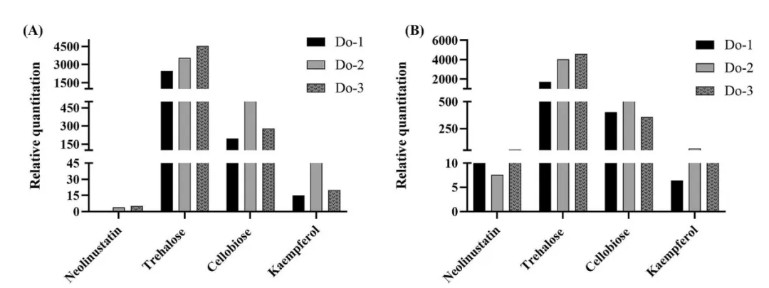 生物碱是一类含氮有机化合物,在植物中具有多种生物活性,包括防御和生长调节功能。新亚麻氰苷(m/z 446.2104)是一种生物碱。研究表明,新亚麻氰苷在保护植物免受草食动物和病原体侵害方面起关键作用。在铁皮石斛茎中,新亚麻氰苷主要分布于维管束区域,且含量随植株年限增加而逐年上升(图8A)。糖类对植物生长发育至关重要,海藻糖(m/z 365.1062)和纤维二糖(m/z 381.0796)的空间分布图像显示,二者在铁皮石斛茎中分布均匀,未出现明显组织分化,且藻酸盐水平较高。总多糖含量测定结果表明,一年生茎(Do-1)中含量较低,二年生茎(Do-2)中较高,三年生茎(Do-3)略有下降但无显著差异(图3B),这一结果与MALDI-MSI离子成像数据一致(图8A)。类黄酮在帮助植物适应环境变化、抵抗胁迫和维持生理稳态中发挥重要作用。山奈酚(m/z 286.9911)是一种具有显著生物活性的类黄酮化合物。研究表明其具有抗炎、抗氧化、抗肿瘤、神经保护和免疫调节特性。对山奈酚空间分布的成像结果显示,其含量随生长年限增加而上升。在二年生茎中,山奈酚在表皮区域附近浓度较高,其他区域分布均匀;而在三年生茎中,表皮区域分布显著减少,其他区域仍保持均匀分布。从MALDI-MSI结果中提取新亚麻氰苷、海藻糖、纤维二糖和山奈酚的相对丰度,并通过条形图展示(图8B)。如图8B所示,新亚麻氰苷和海藻糖的丰度随年限增加而逐年上升。二年生茎中海藻糖和纤维二糖浓度最高,三年生茎中略有下降。