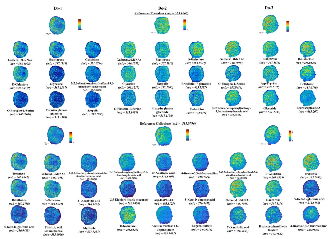 图9.通过离子迁移谱(IMS)测量提取的新亚麻氰苷、海藻糖、纤维二糖和山奈酚在(A)表皮和(B)维管束区域中的相对化合物含量。植物代谢物的共定位分析采用皮尔逊相关系数和曼德斯共定位系数,用于定量分析并探索代谢物之间的关联性,研究不同生长阶段植物中多种代谢物的共存关系或其空间分布的重叠情况。本研究对糖类物质(海藻糖和纤维二糖)进行了共定位分析,结果如图10所示。在铁皮石斛的不同生长时期,海藻糖与D-半乳糖、半乳糖基-β-1,3-N-乙酰氨基葡萄糖表现出明显的共定位现象,它们的空间分布及含量变化高度相似。纤维二糖与D-半乳糖之间也存在强相关性,表明它们在代谢物合成、运输及其他代谢功能方面具有密切联系。