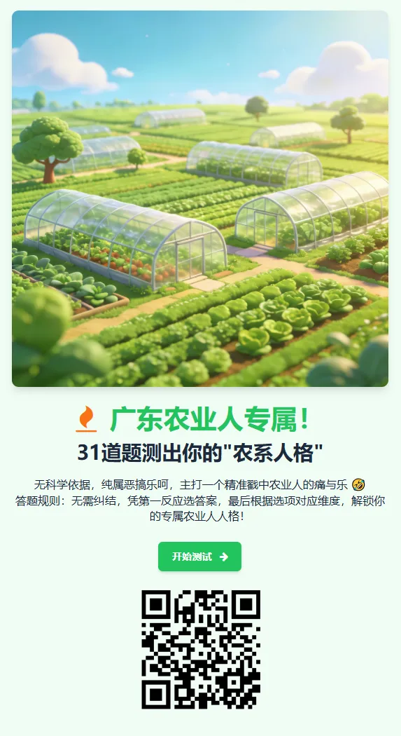 小编也试着做个了一下【农业版NMTI人格测试】,简单好玩、全程无套路,既能打发时间,又能找到共鸣,转发给身边种地的朋友,一起解锁专属农系人格吧!