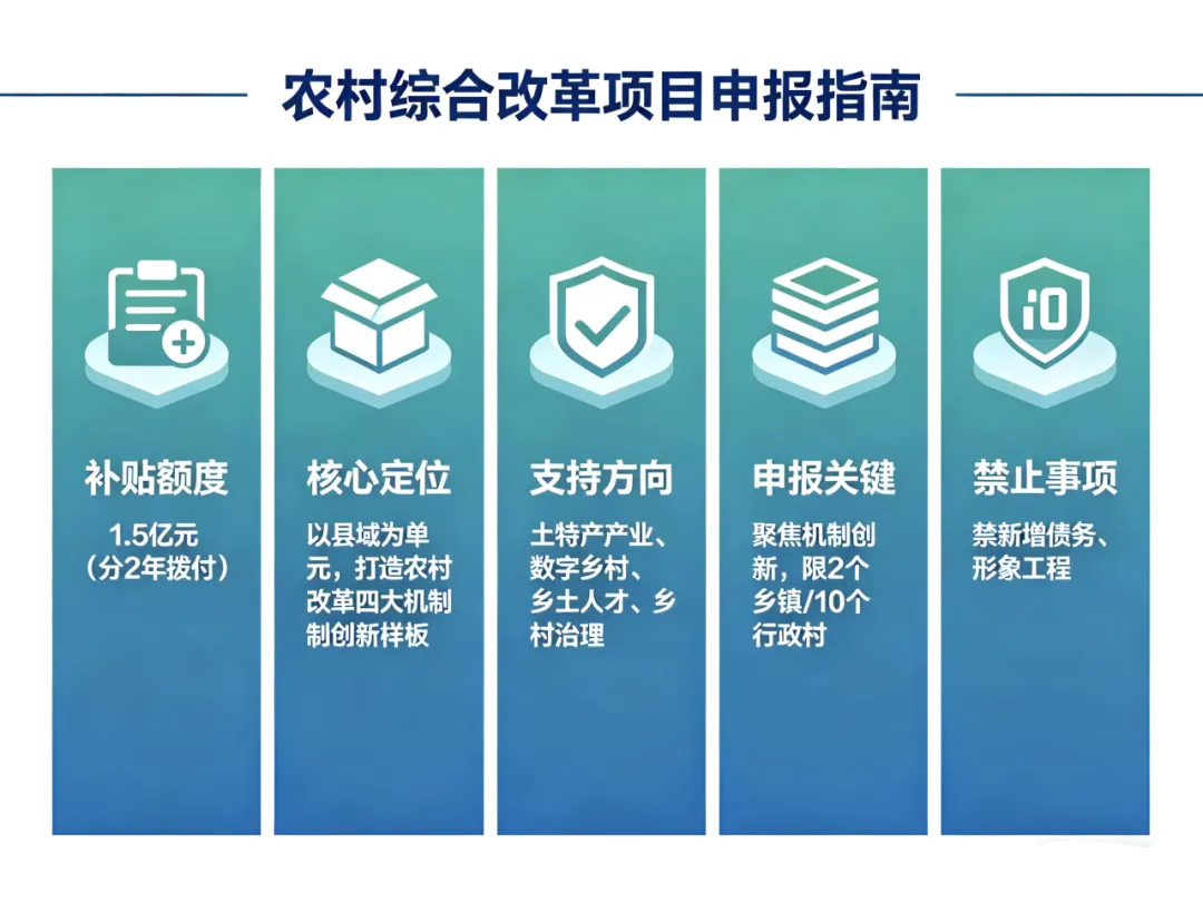 - 申报关键:聚焦机制创新,限2个乡镇/10个行政村,禁新增债务、形象工程。