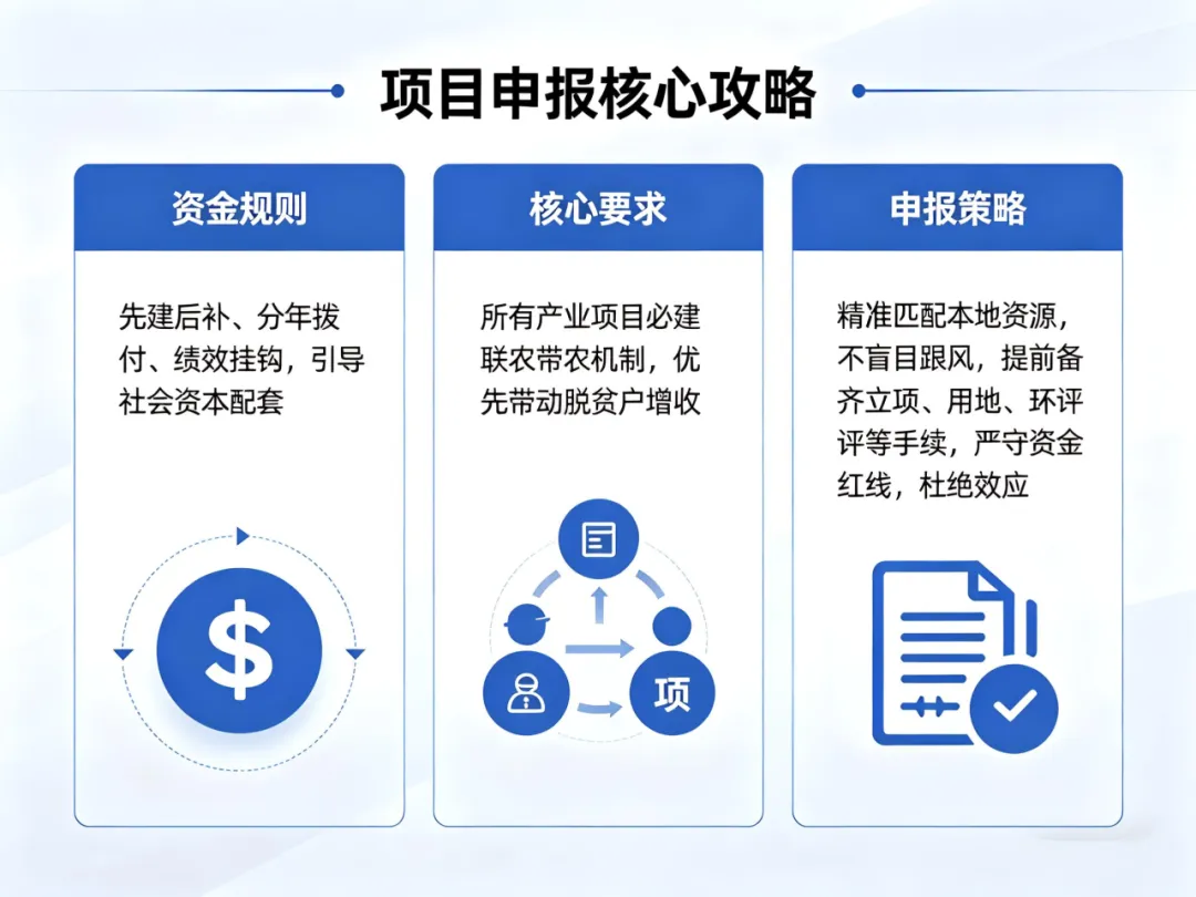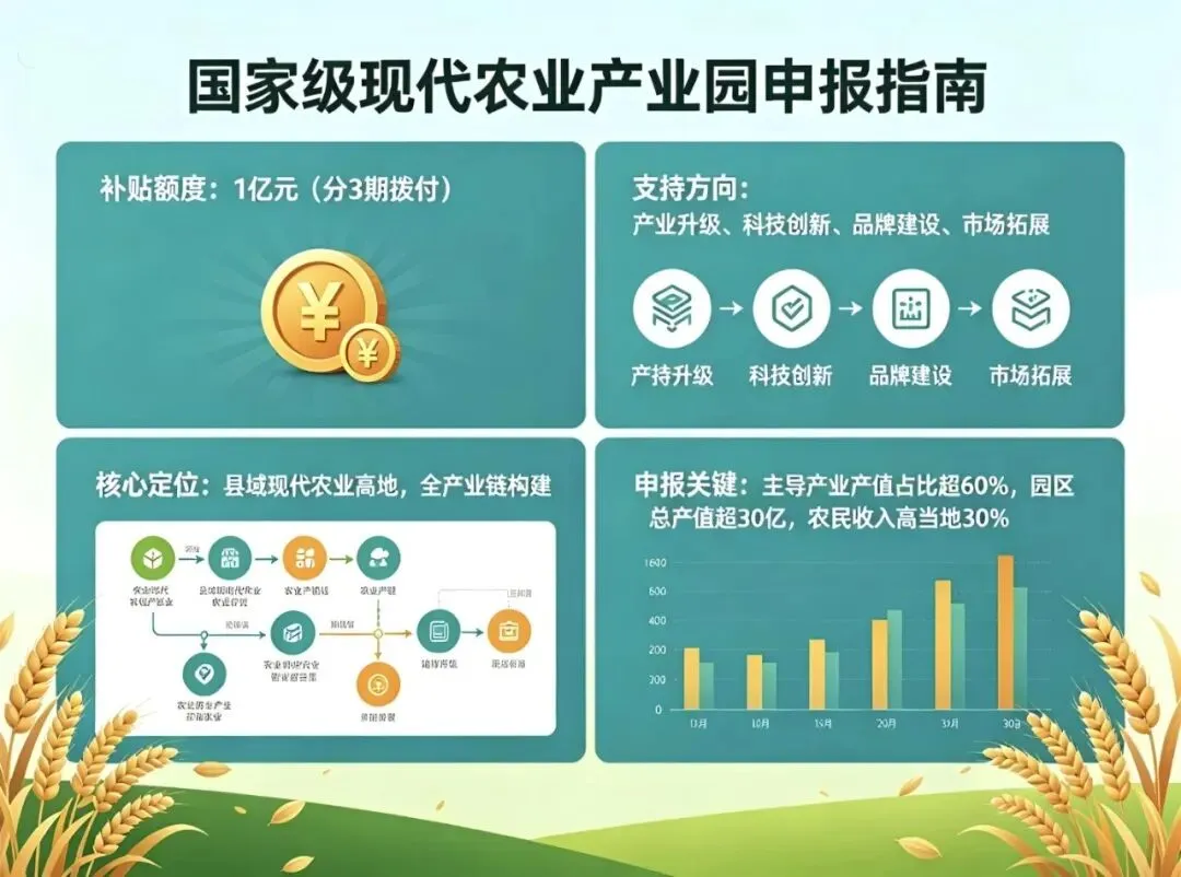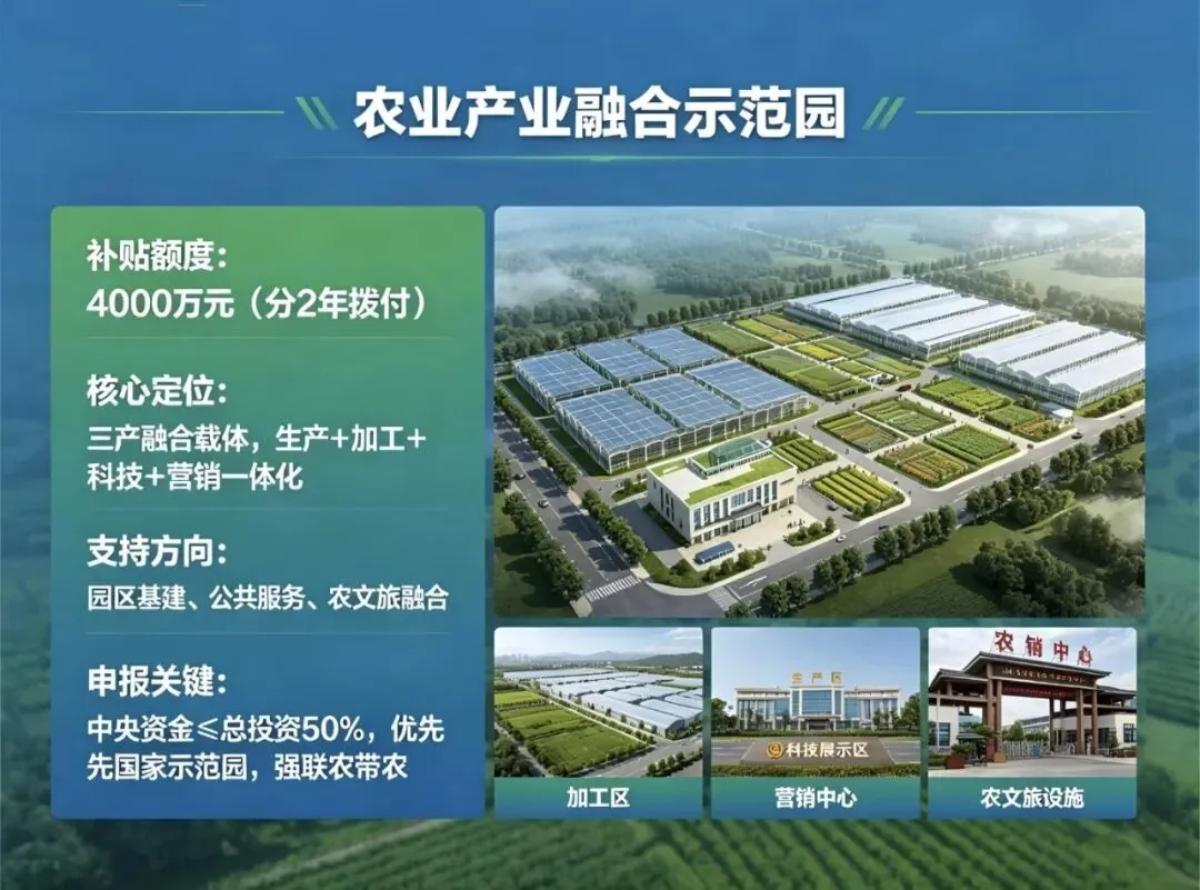 - 申报关键:中央资金≤总投资50%,优先国家示范园,强联农带农。