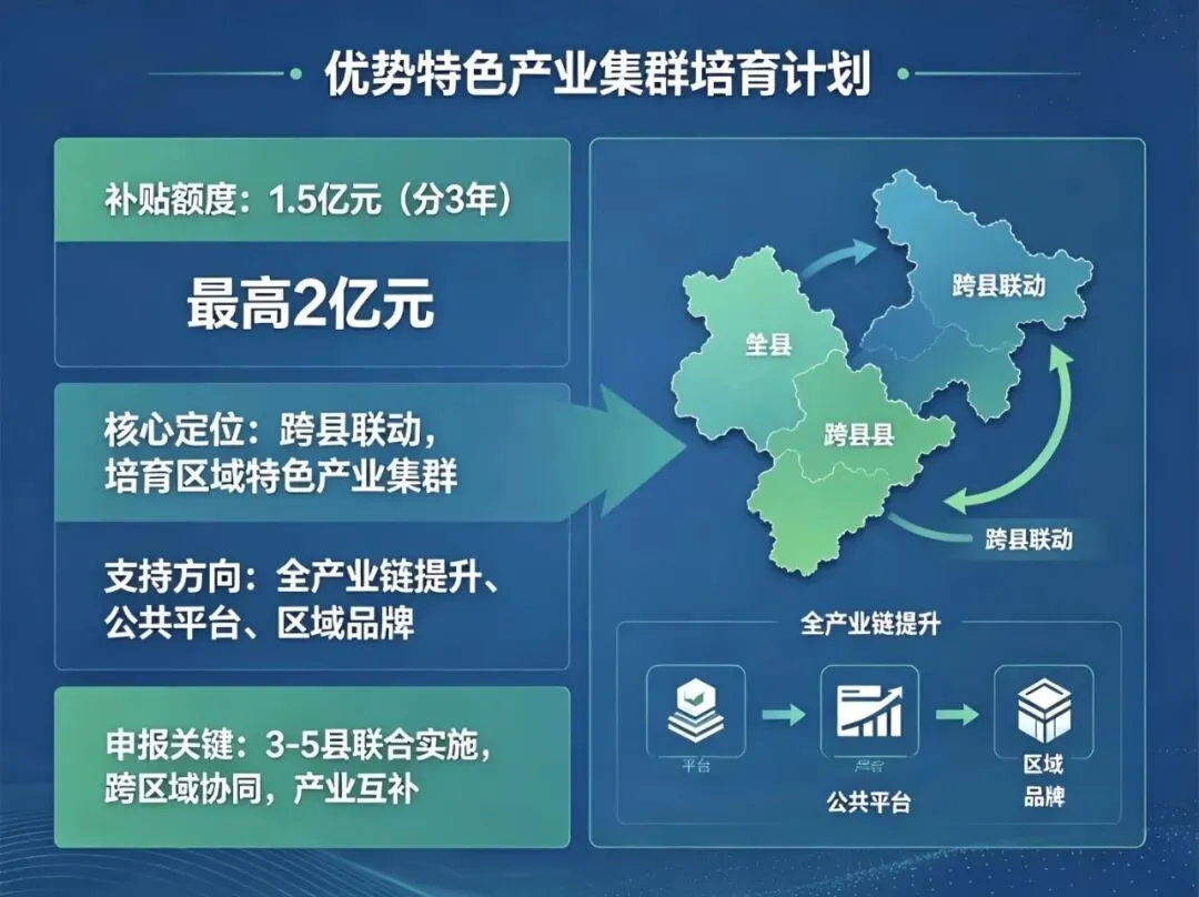 - 支持方向:全产业链提升、公共平台、区域品牌