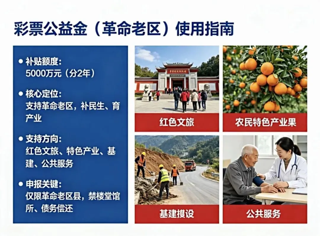 - 申报关键:仅限革命老区县,禁楼堂馆所、债务偿还。