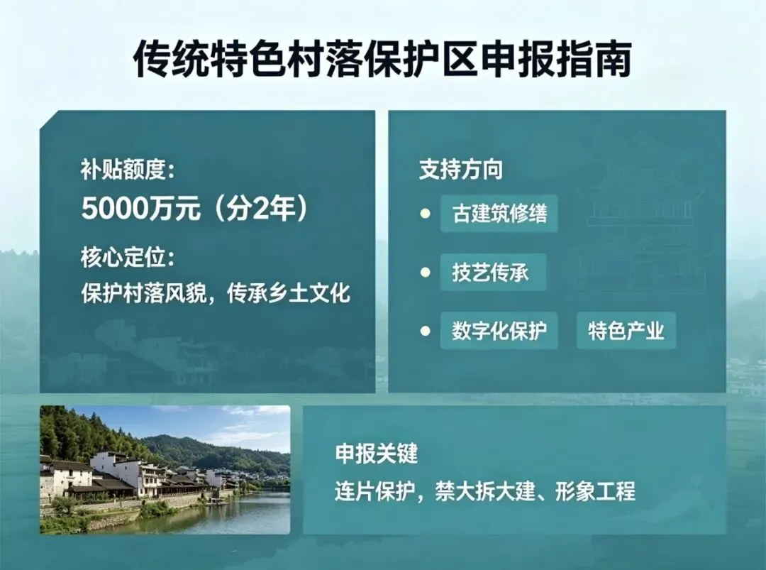 - 支持方向:古建筑修缮、技艺传承、数字化保护、特色产业